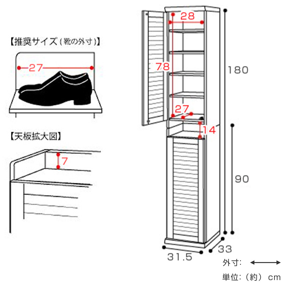 | サイズ | 約 幅31.5×奥行33×高さ90(cm) 扉内内寸:幅28×奥行27×高さ78(cm) オープン部:幅28×奥行27×高さ7(cm) |