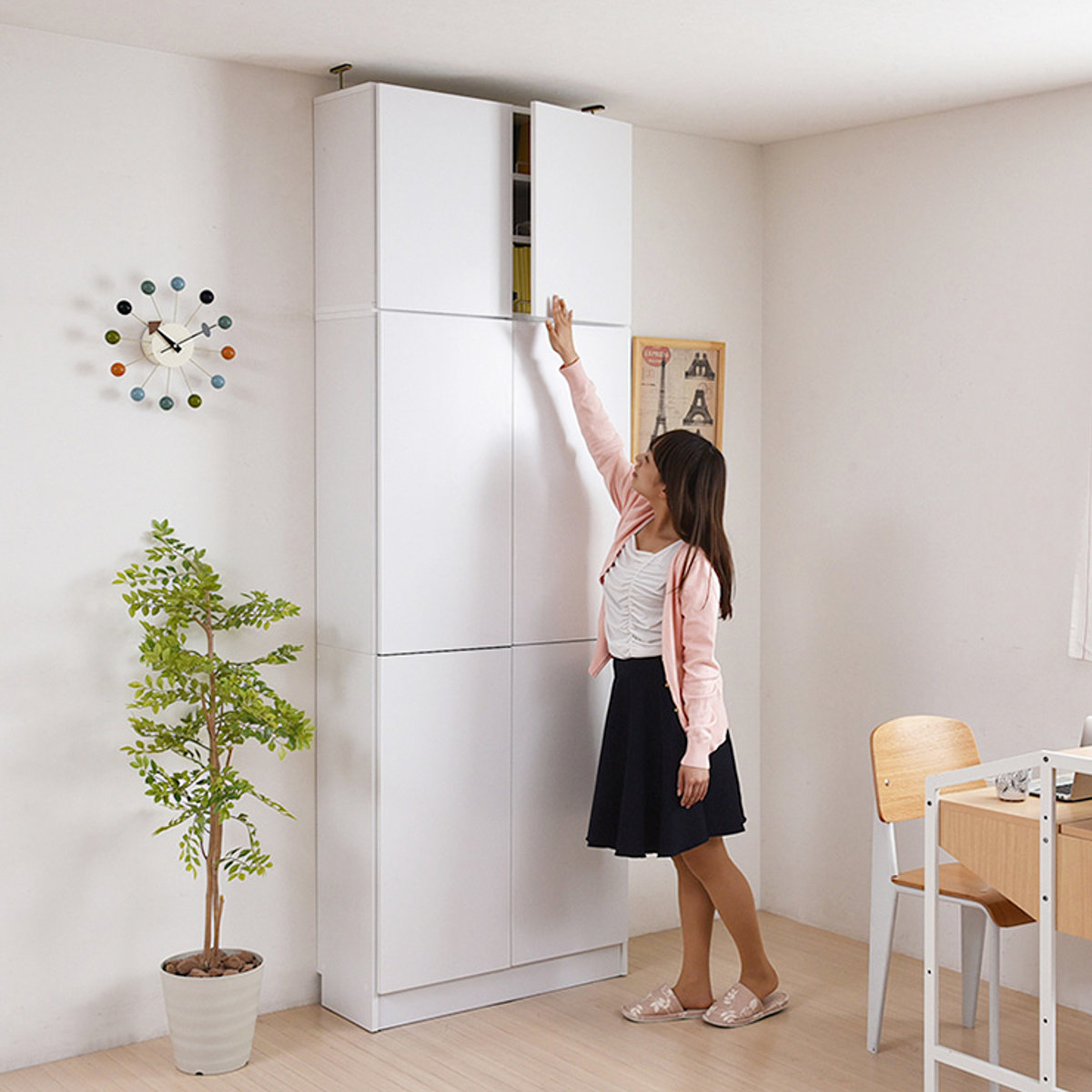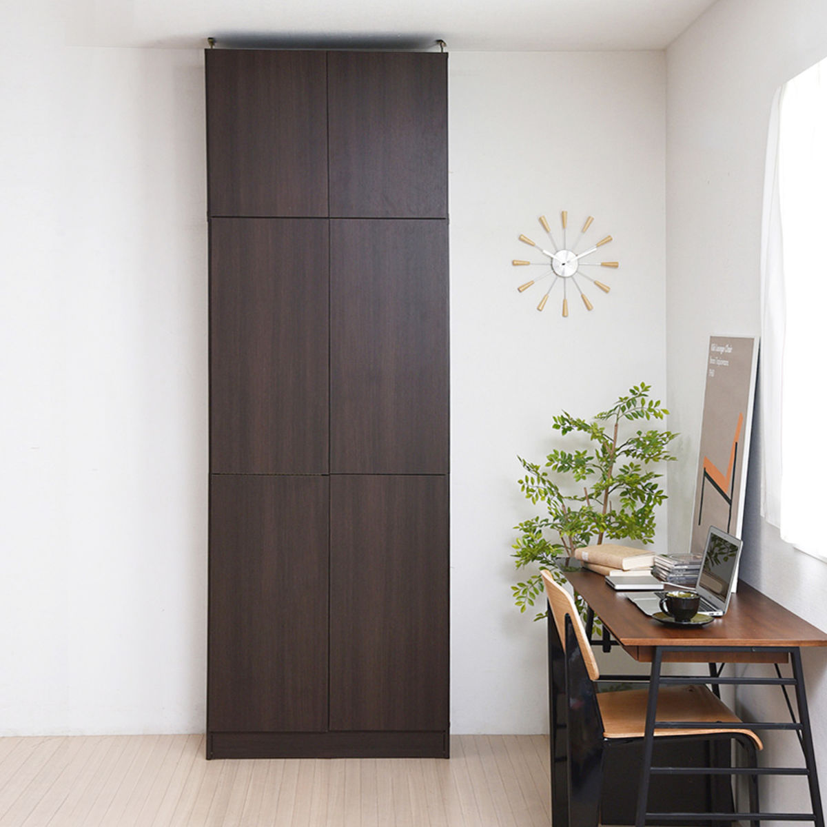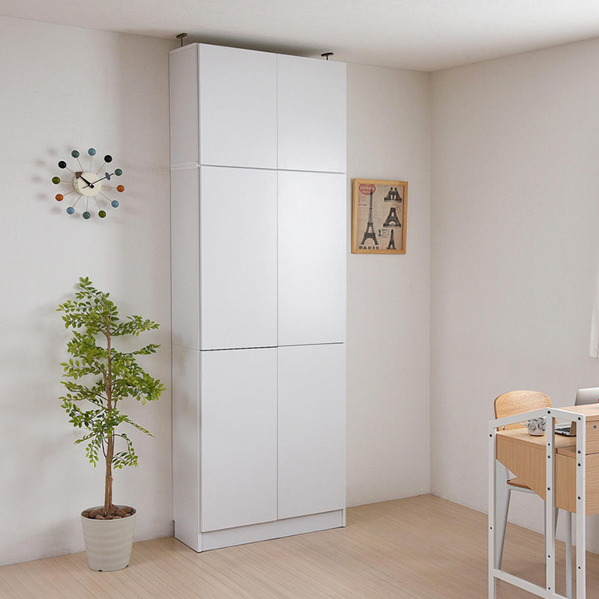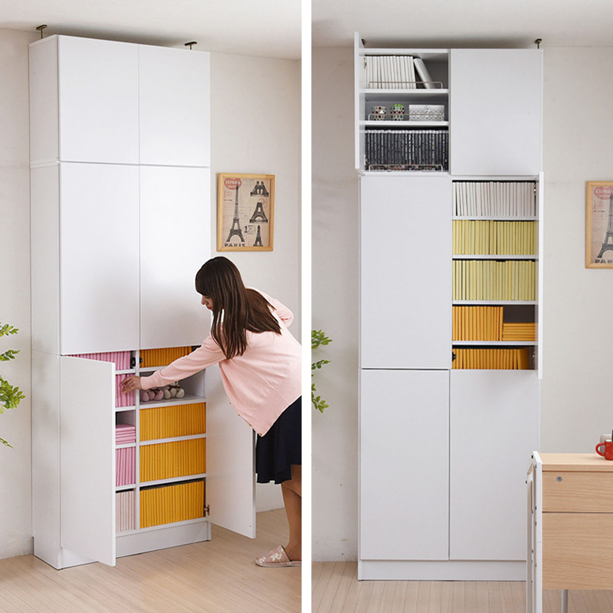 天井までスッキリ収納できる上置き棚がセットです。突っ張り金具で天井の高さによって突っ張りの長さを調節できるので、どんな場所でも安心です。