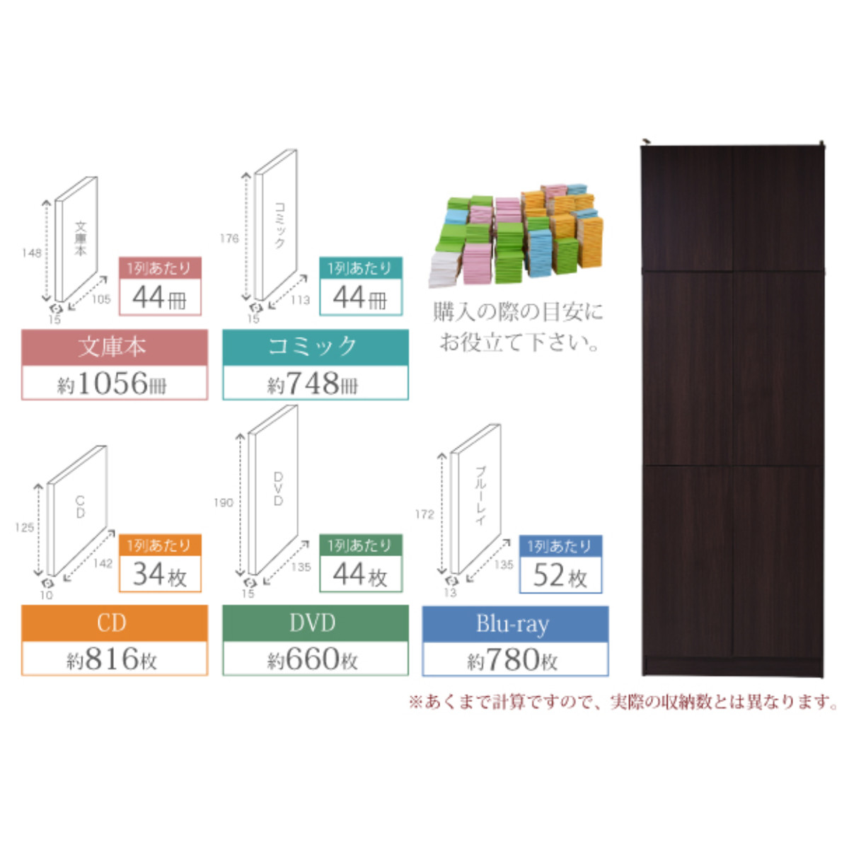 文庫本は約1056冊、コミック約748枚、CD約816枚、DVD約660枚、Blu-ray約780枚、収納することができます。