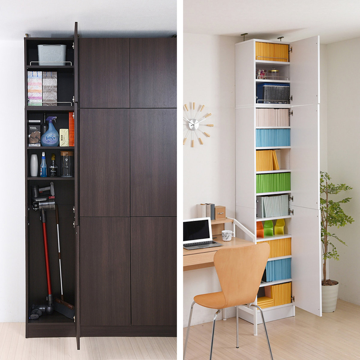 扉付きなので、見た目もスッキリとスマートな空間になります。来客時などは扉を閉めておけば、目隠し扉として使うことができ便利です。書籍や雑誌以外に日用品や食料品の収納にもお使いいただけます。