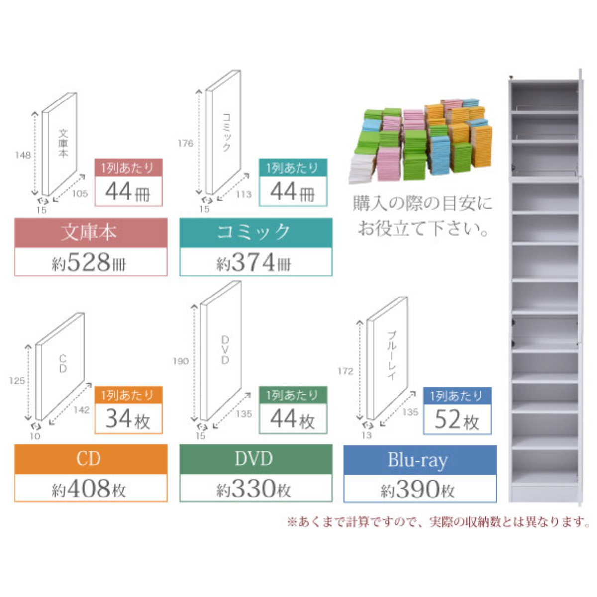 文庫本は約528冊、コミック約374枚、CD約408枚、DVD約330枚、Blu-ray約390枚、収納することができます。