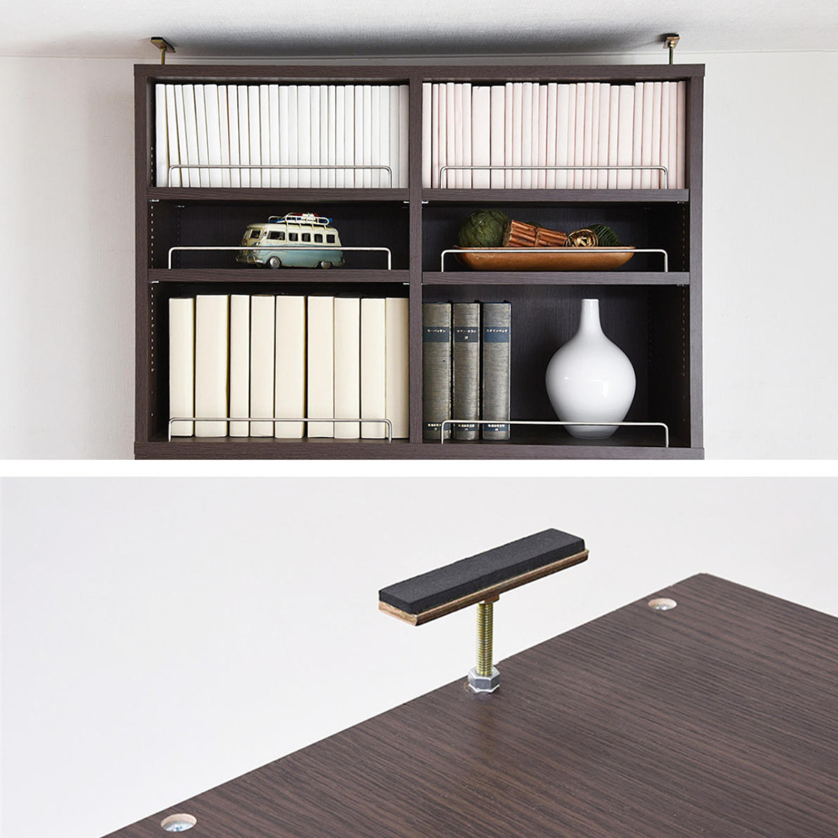 天井までスッキリ収納できる上置き棚がセットです。突っ張り金具で天井の高さによって突っ張りの長さを調節できるので、どんな場所でも安心です。