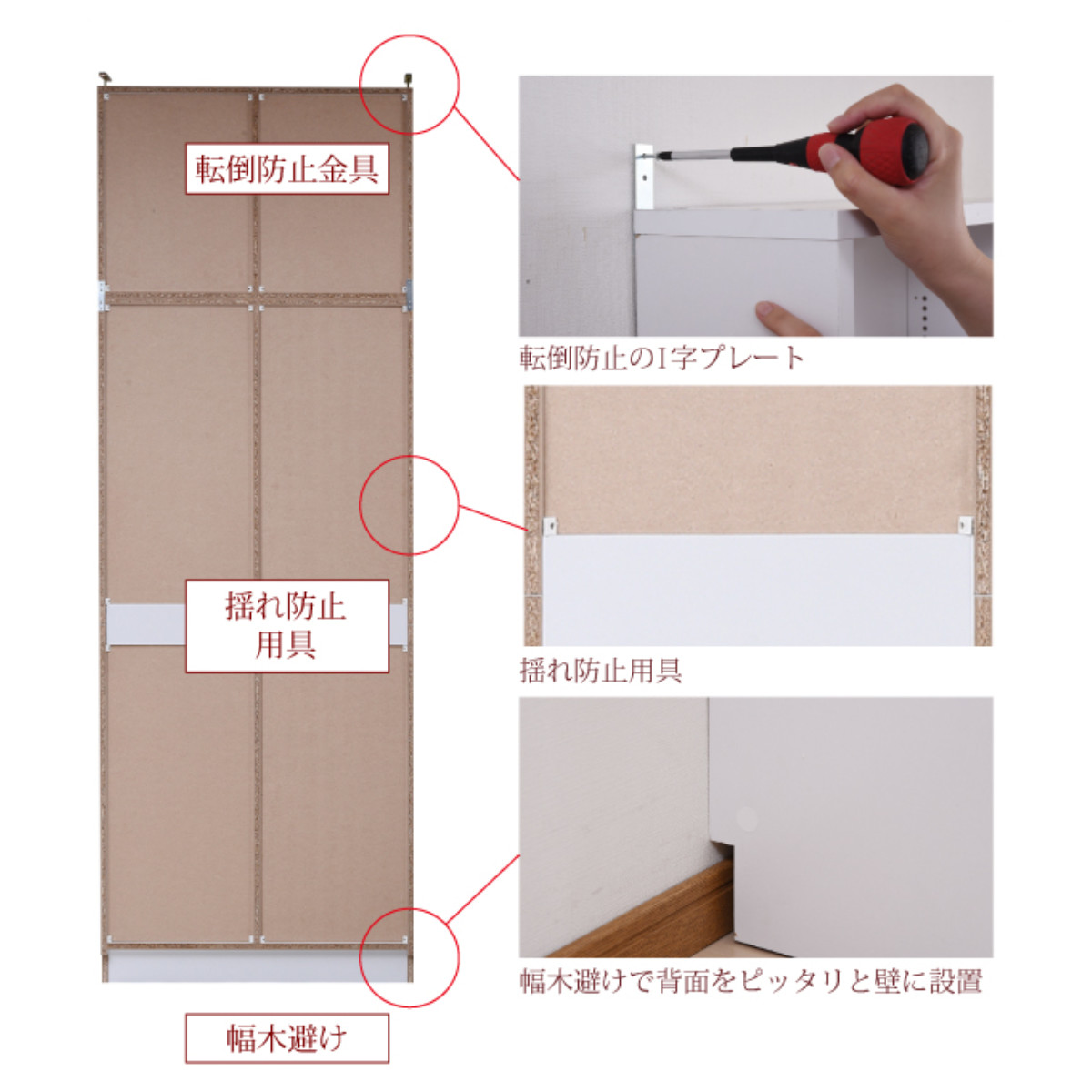 転倒防止金具、背面には揺れ帽子用具を取り付けられ、幅木避け加工で背面を壁にピッタリと付けて設置ができます。また、背板には安定さを維持する裏側固定が施されているのでたくさん収納しても安心です。