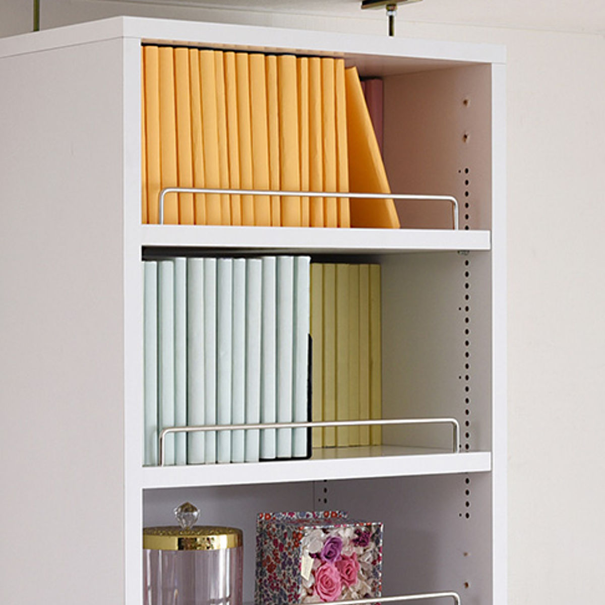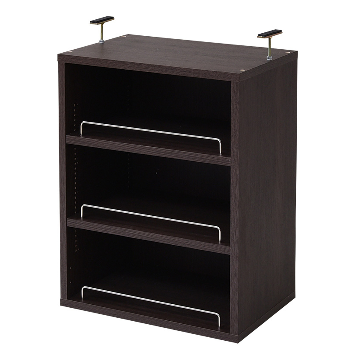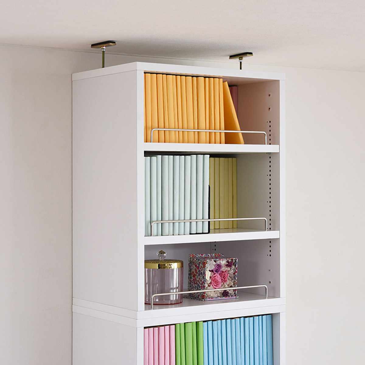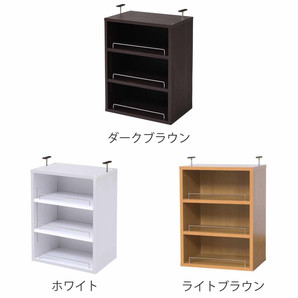 天井までスッキリ収納できる上置き棚がセットです。突っ張り金具で天井の高さによって突っ張りの長さを調節できるので、どんな場所でも安心です。