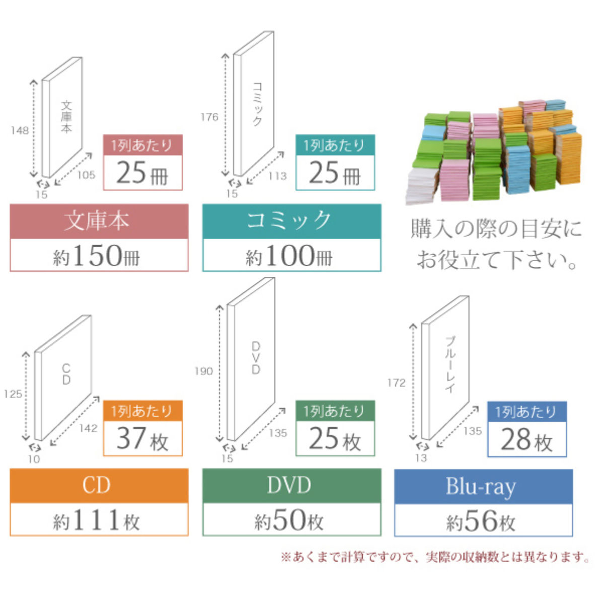 文庫本は約150冊、コミック約100枚、CD約111枚、DVD約50枚、Blu-ray約56枚、収納することができます。