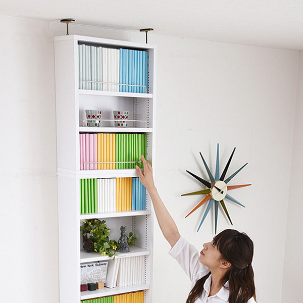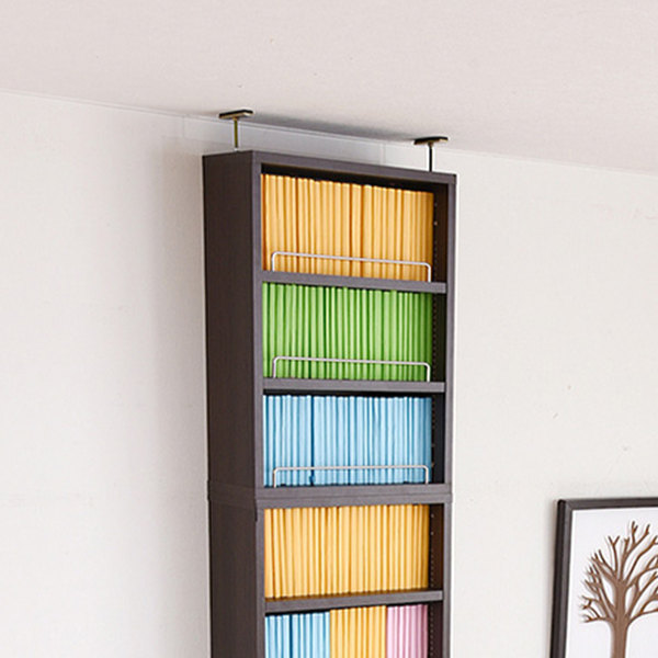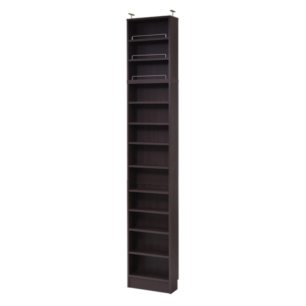 天井までのスペースを有効活用できる上置きは、耐震対策の突っ張り金具で万が一の時にも安心です。高い所から物が落下しないよう、ブックガードを付けることもできます。本体と上置きはダボで連結するので安心してお使いいただけます。