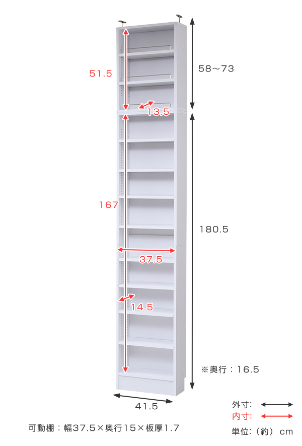 | サイズ | 約 幅41.5×奥行16.5×高さ180.5(cm) 上置き:約 幅41.5×奥行16.5×高さ58~73(cm) |