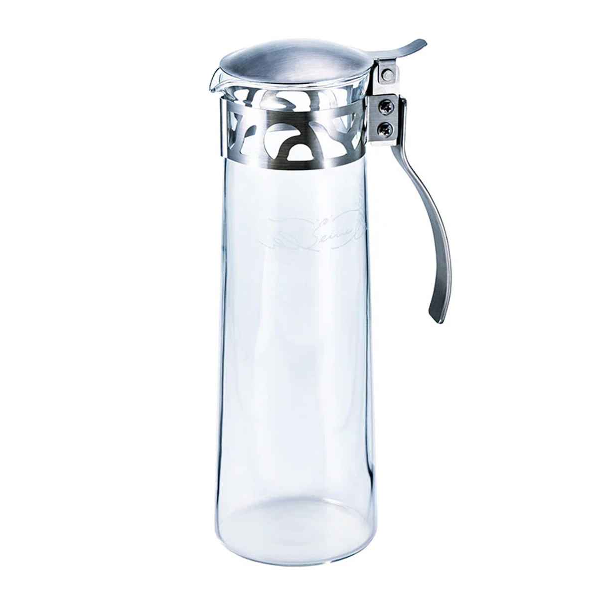 ステンレス製の取っ手が付いたピッチャーです。耐熱ガラス製なので、熱湯をそのまま入れることも可能です。また、ニオイも付きにくいので、ジュースなどを入れても安心です。
