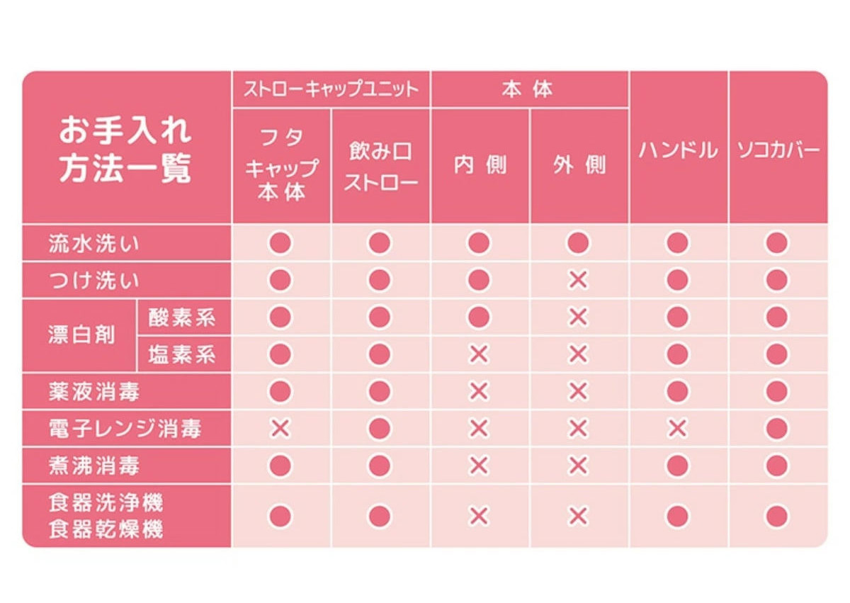 | パーツ別耐熱温度 | フタ・キャップ本体・ハンドル:100度 飲み口・ストロー・底カバー:140度 |