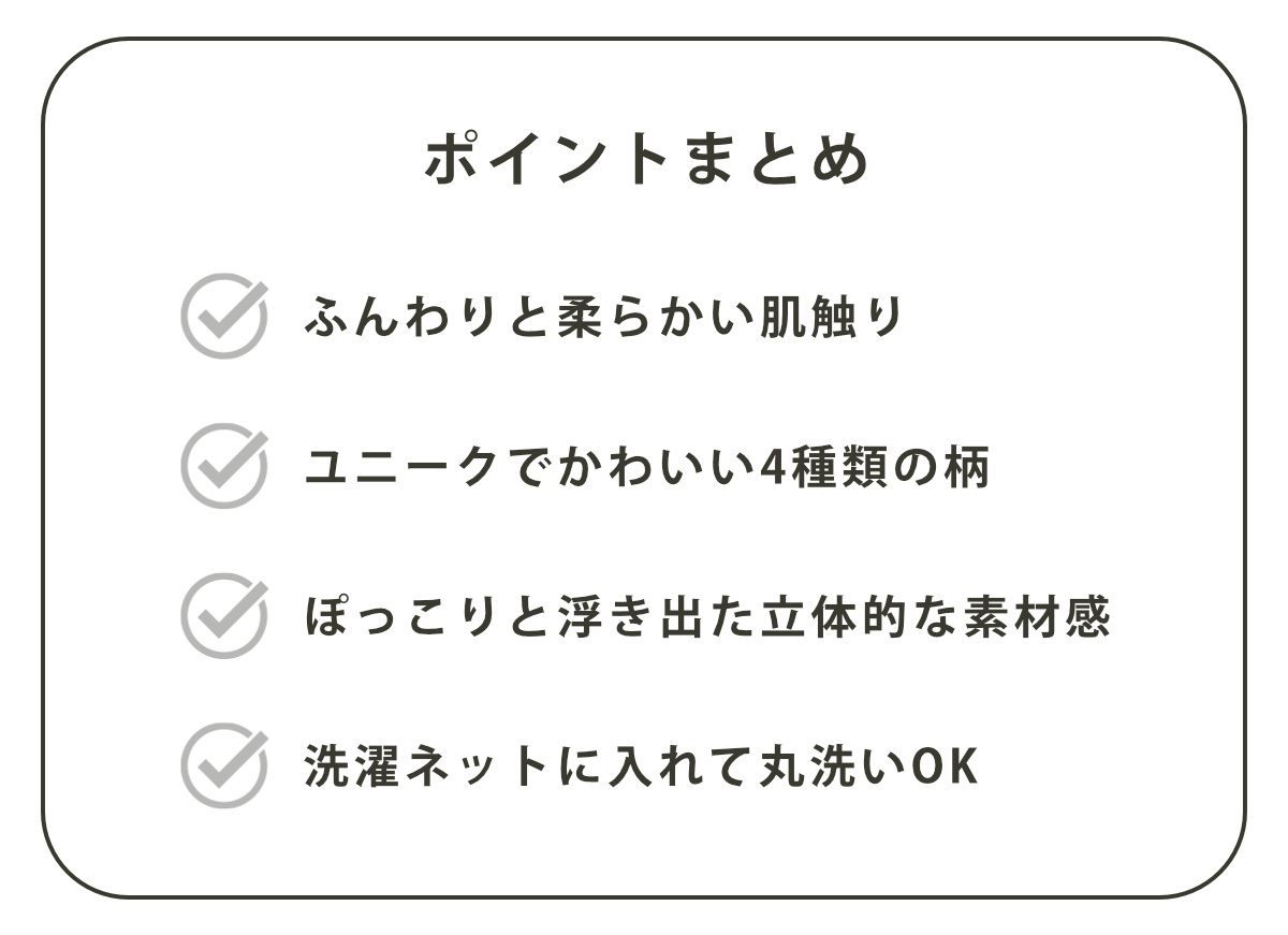 花やねこ、くまなどのユニークでかわいい4種類の柄がございます。お好みの色やテイストに合わせてお選びいただけます。