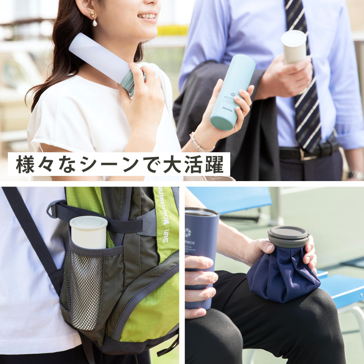 特に暑さが辛くなってくる時期に最適です。小さなお子様にもお使いいただけるので、ピクニックや炎天下の通学等の移動、スポーツ観戦など、幅広いシーンで熱中症対策として大活躍します。夏場に限らず冬場は発熱時のアイシングにもご使用いただけます。年間を通して使えるので自然にも優しいエコな商品です。