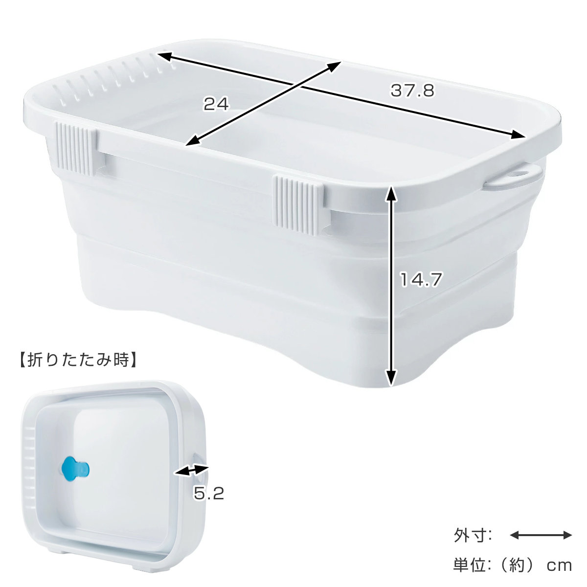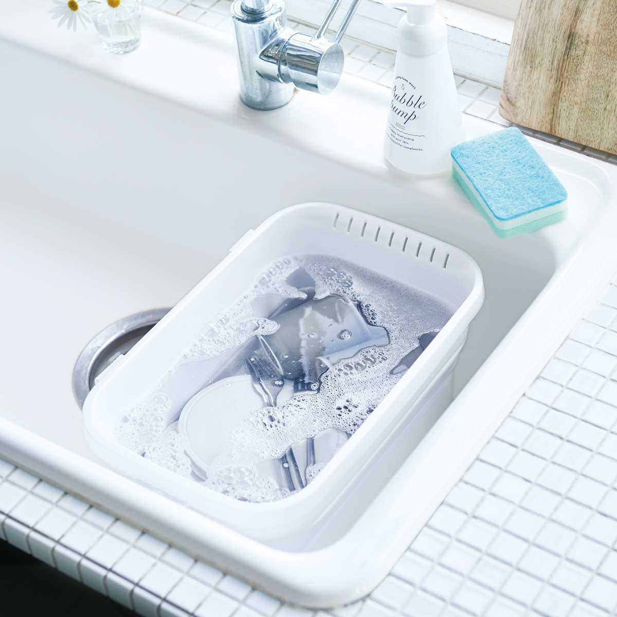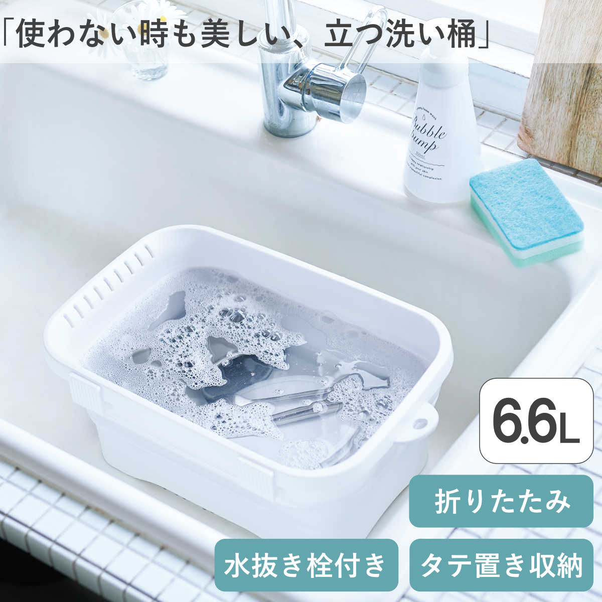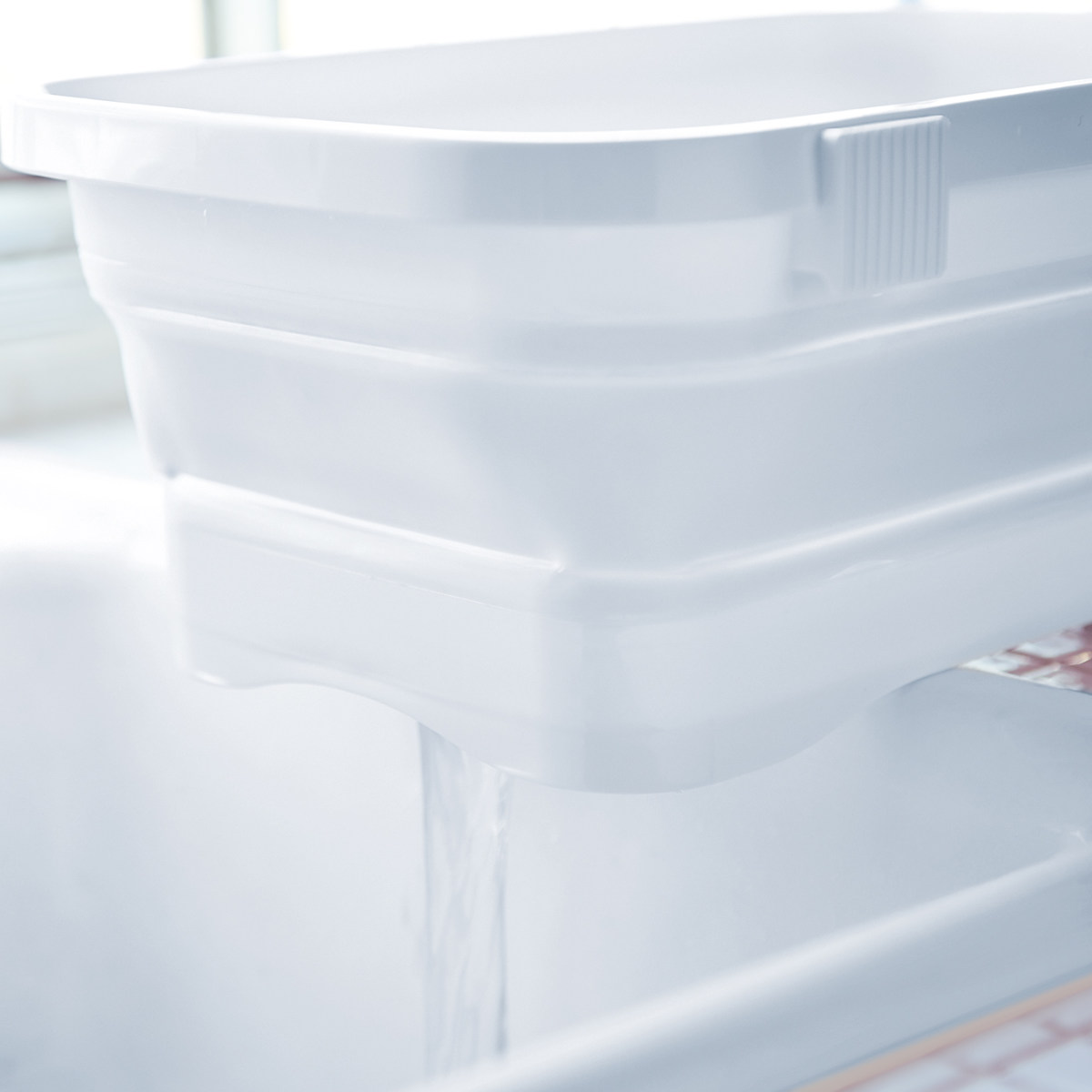 野菜やフルーツの水洗い、食器のつけ置きなどに最適な洗い桶です。洗い桶を使う事によって節水にもなり環境にも優しいです。使わないときは両サイドを押し込むだけで簡単にたためます。たたむと厚さ約5.2cmとコンパクトになるため、キッチンのちょっとした隙間に収納できます。