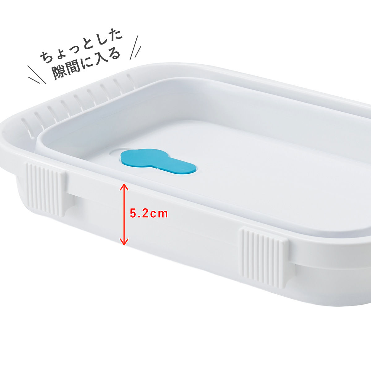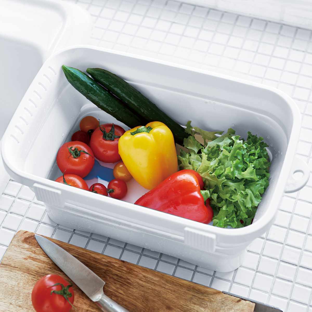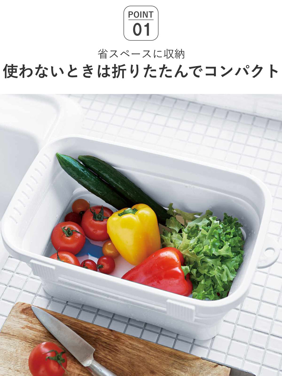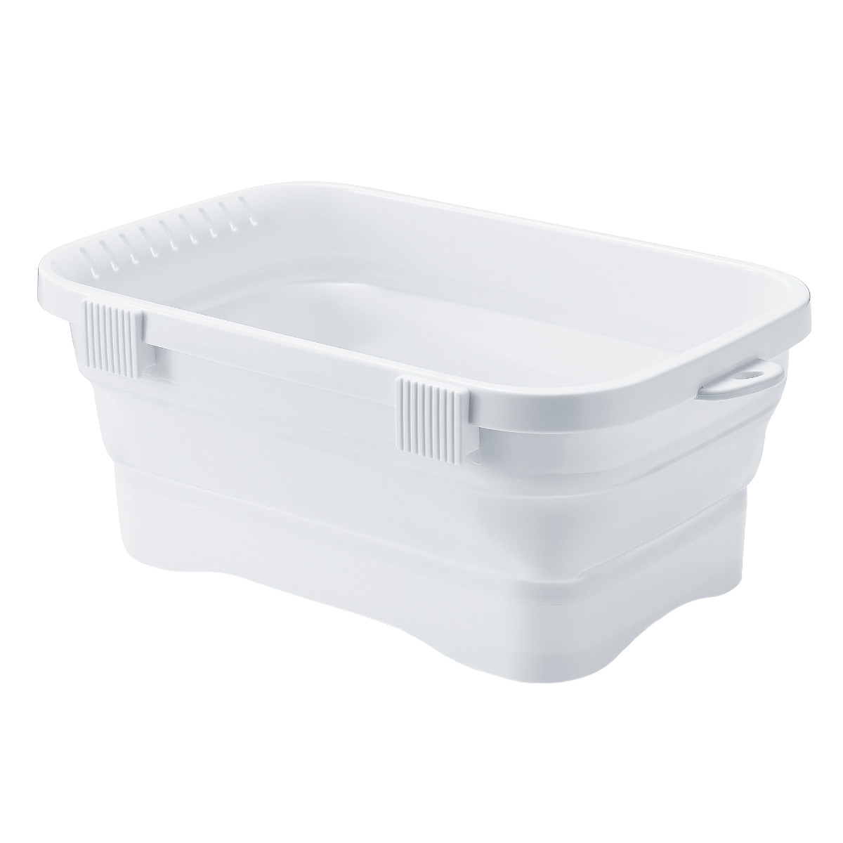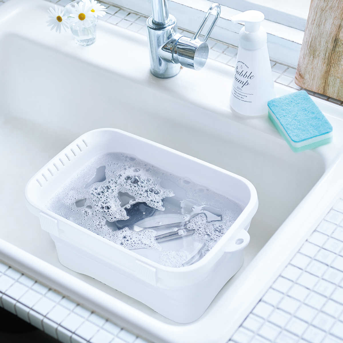 野菜やフルーツの水洗い、食器のつけ置きなどに最適な洗い桶です。洗い桶を使う事によって節水にもなり環境にも優しいです。使わないときは両サイドを押し込むだけで簡単にたためます。たたむと厚さ約5.2cmとコンパクトになるため、キッチンのちょっとした隙間に収納できます。