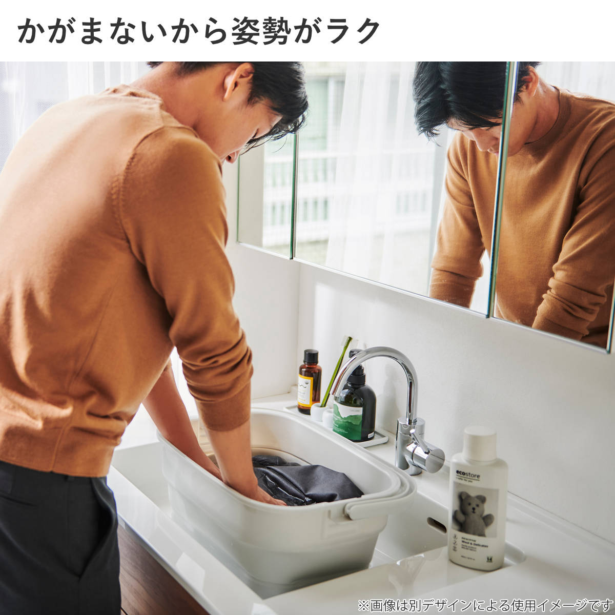 洗面台にも収まる大きさです。立ちながらつけ置き洗いができるため、ラクな姿勢で作業できます。水を入れる時に蛇口が引っ掛かりにくい高さなのも嬉しいポイントです。