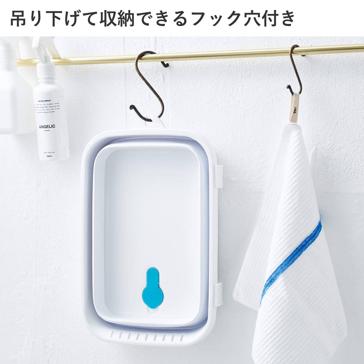 バケツにはフックを掛けられる穴が付いており、吊り下げてスッキリ収納できます。使いたいときにサッと手に取れる、便利な収納スタイルです。