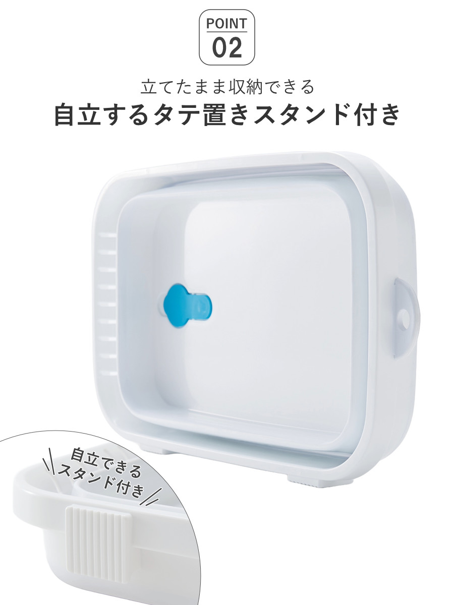 自立できるタテ置きスタンド付きです。狭い場所でもまっすぐ立てたまま、乾燥や収納ができます。