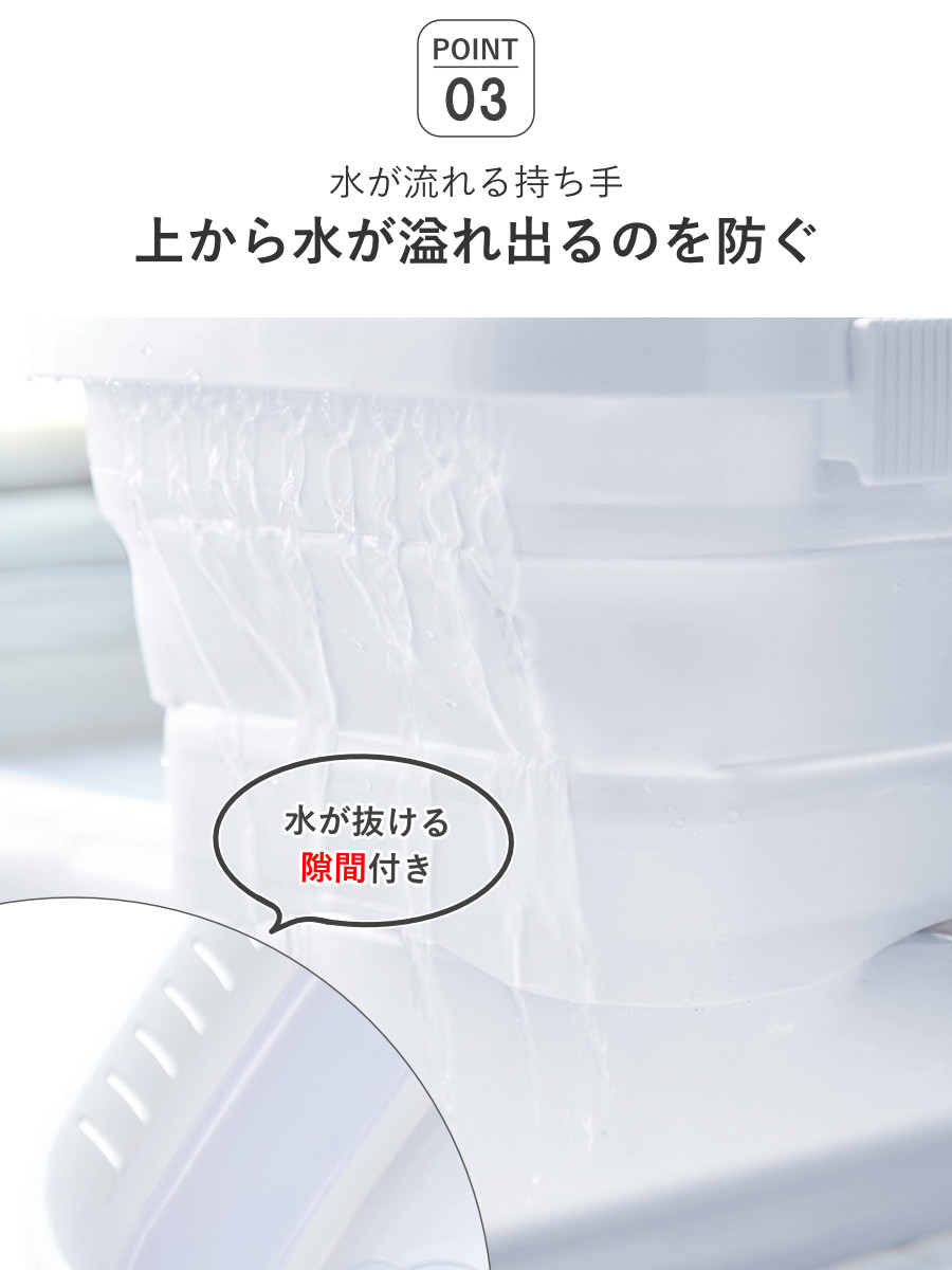 持ちやすいハンドルが付いており、たくさん水が入っても安定感があります。フチには水が抜ける隙間があるので、上から水が溢れ出るのを防ぎます。