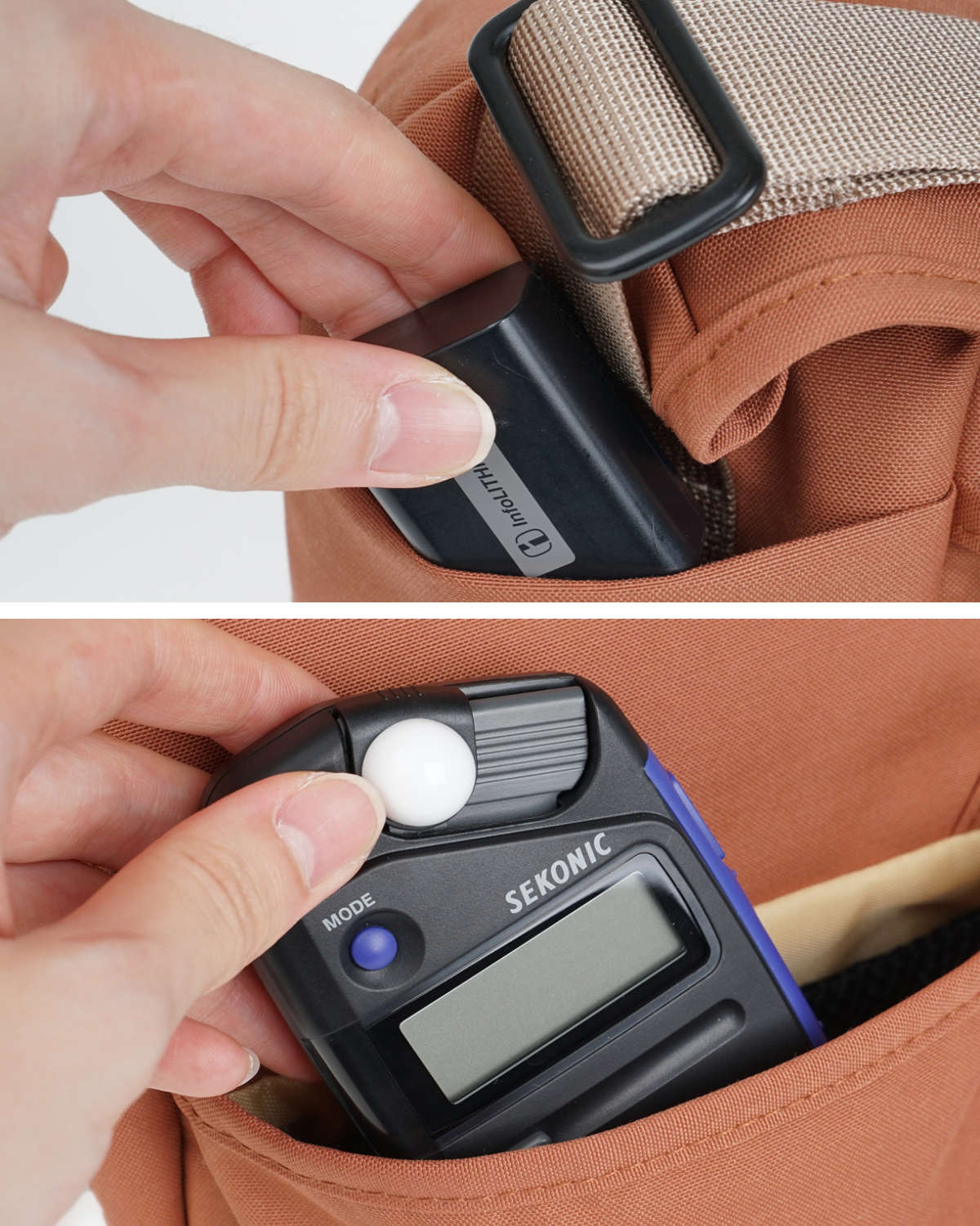 前面にはマグネット開閉式のスリップポケット、サイドには二つのポケットが付いています。予備バッテリーやSDカード、メンテナンス用品など細かなアクセサリー類もきちんと収納できます。