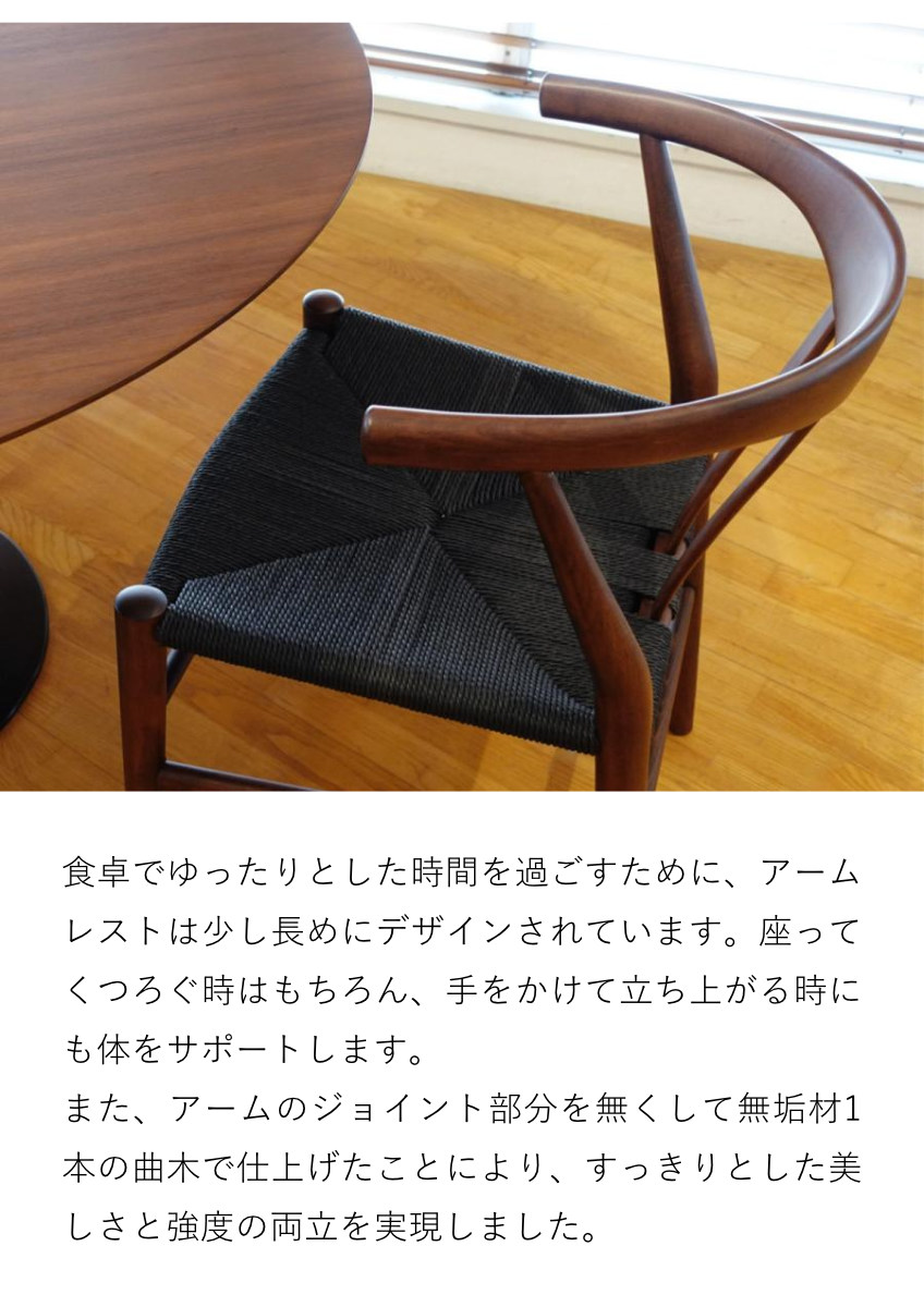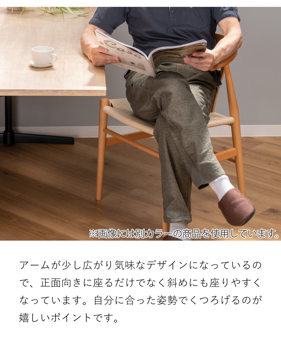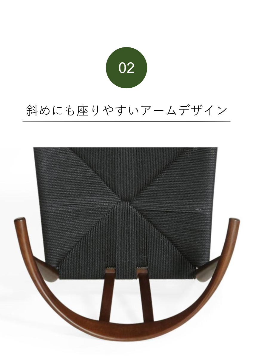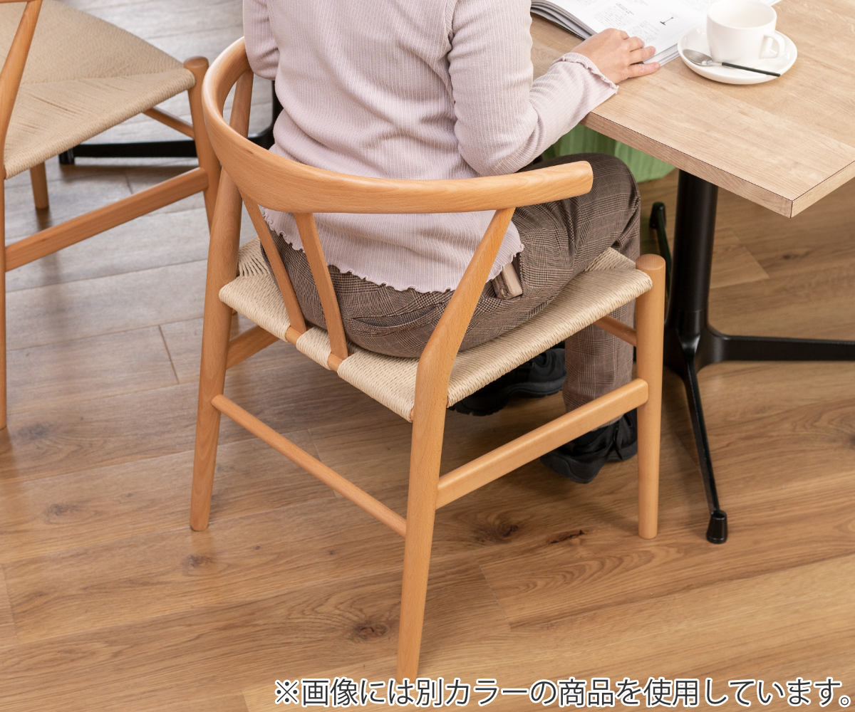 座面はペーパーコードを使用し、一つひとつ手作業で編んで作られているチェアです。座面の四辺から中央に向かって緩やかに凹んでいるのでお尻を優しく包み込んでくれるような感覚があり、ゆったりとした座り心地となっています。また、無垢材で作られたフレームは、木の温もりをご堪能いただけます。