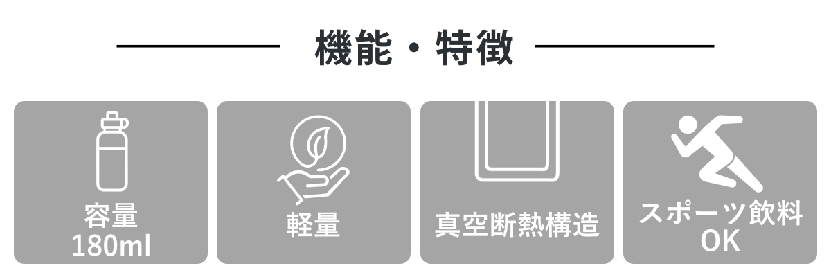 | 材質 | 内びん:ステンレス鋼 胴部:ステンレス鋼(アクリル樹脂塗装) 蓋:ポリプロピレン(発泡ポリプロピレン内蔵) パッキン:シリコーンゴム |