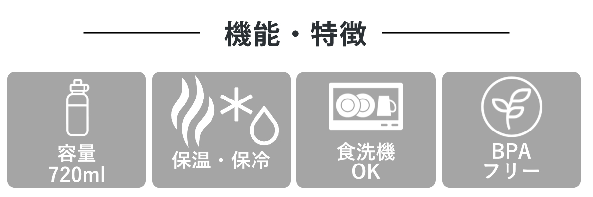 サイズ展開は2サイズです。夏場の暑い日に出かける時に重宝する600mlと、水分補給をたっぷりしたいスポーツシーンで活躍する720mlです。