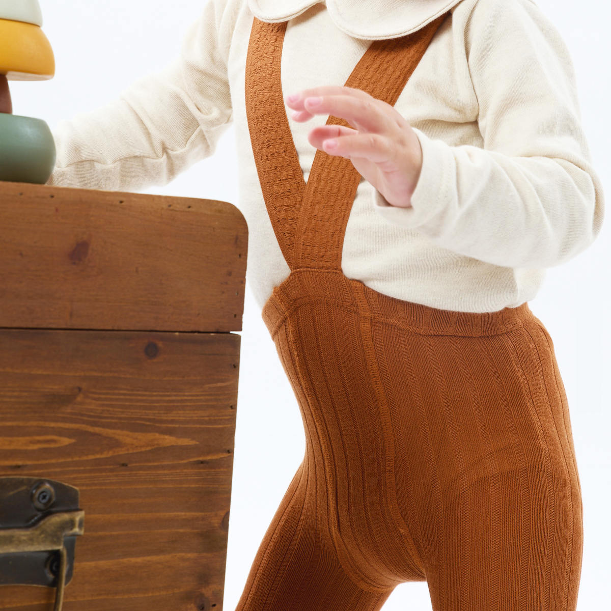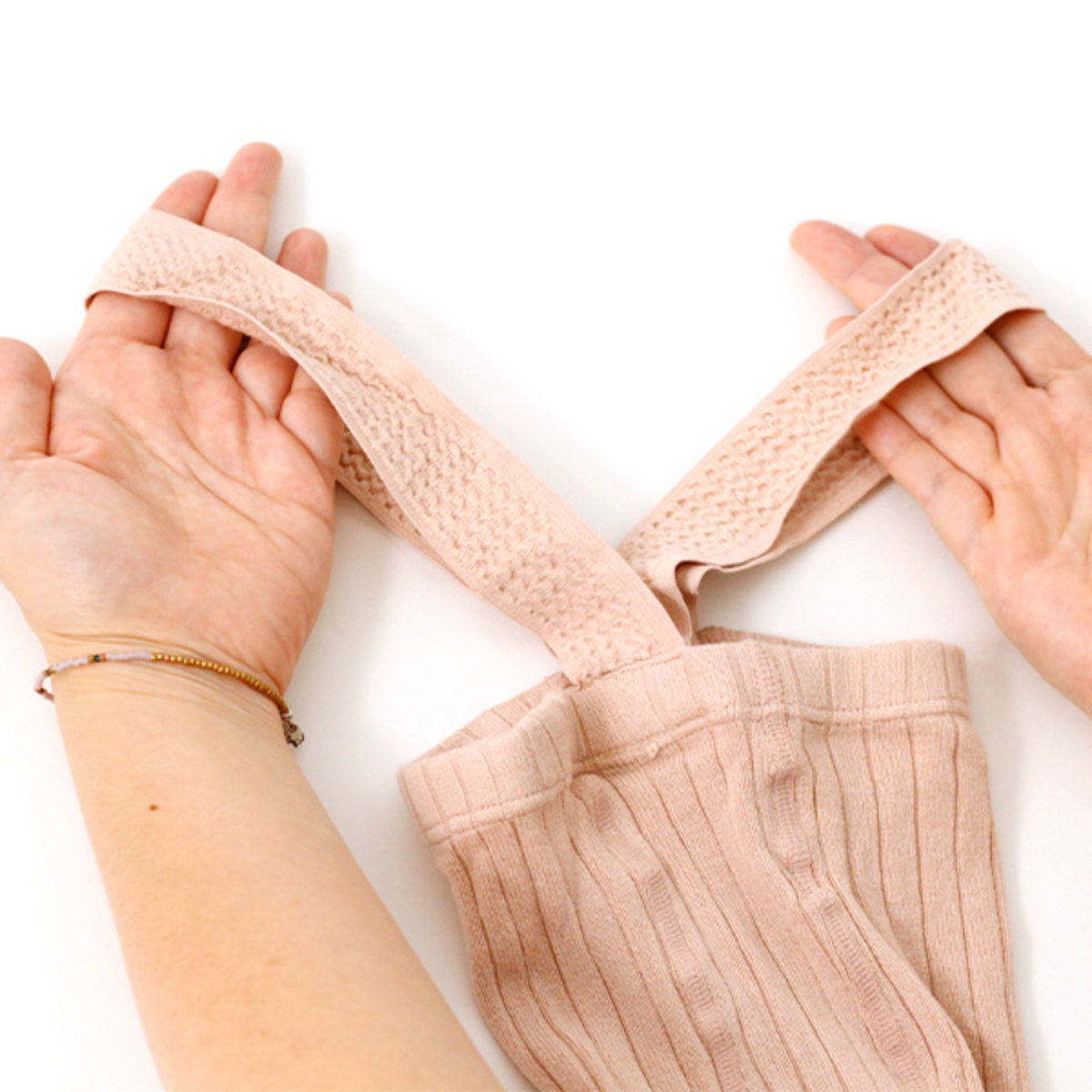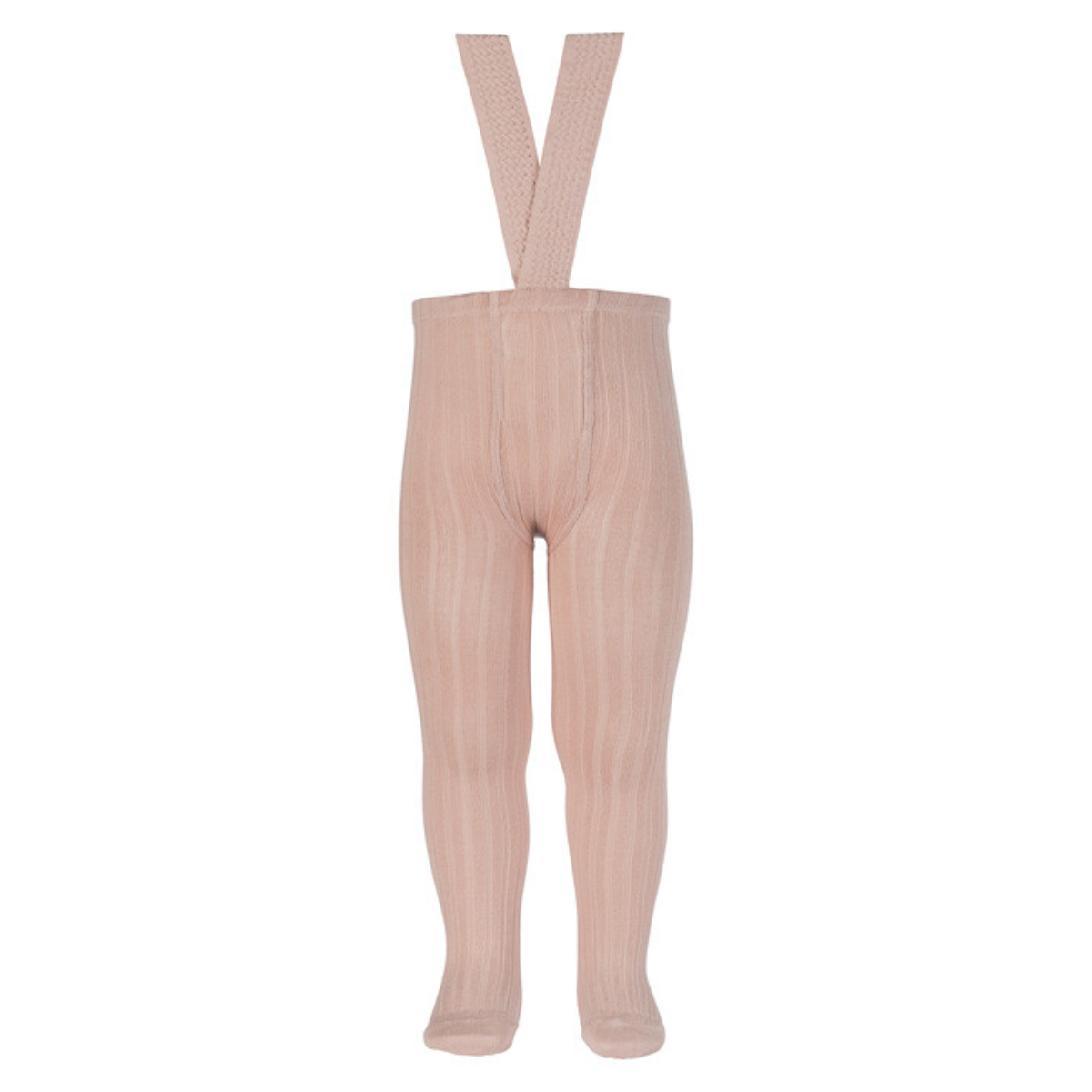 縦のラインが脚をスッキリ見せてくれるサスペンダー付きリブタイツです。サスペンダーはウエスト部分にしっかり固定されているので、あちこち沢山動きまわっても脱げる心配はありません。