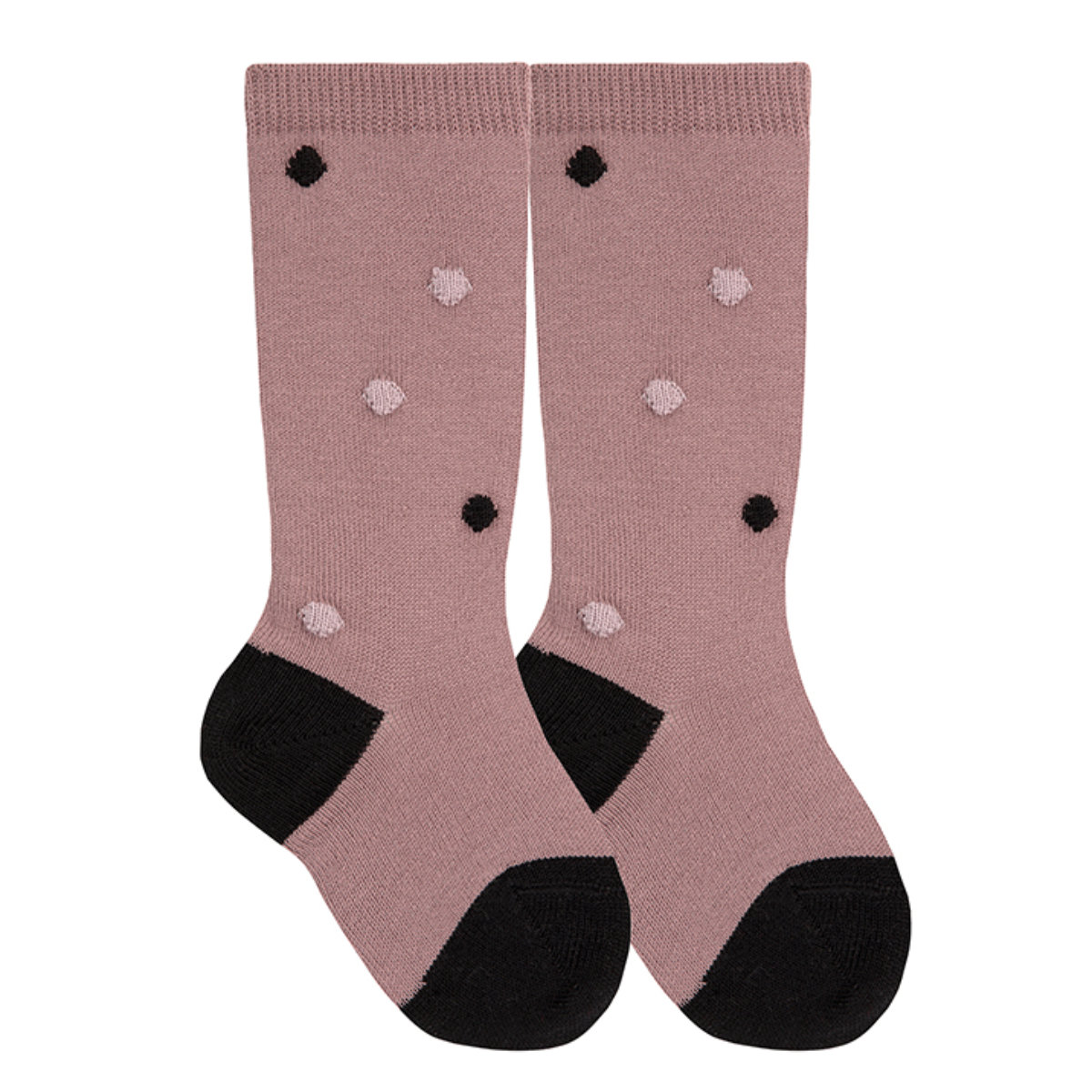 色違いの飾り玉が付いたニーソックスです。立体的な柄とバイカラーでオシャレなデザインです。