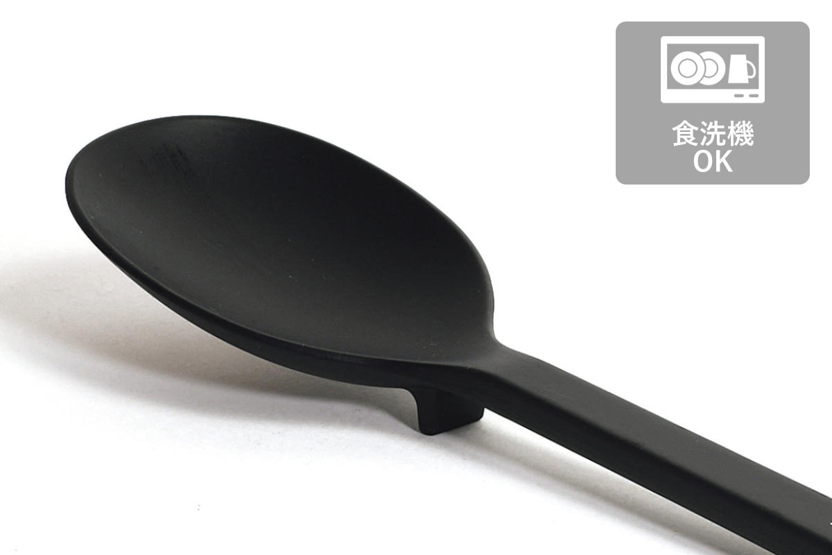 シリコーン素材の調理スプーンです。平らな場所であればどこに置いても先が浮くので、調理中ちょっと手放したい時にとっても便利です。