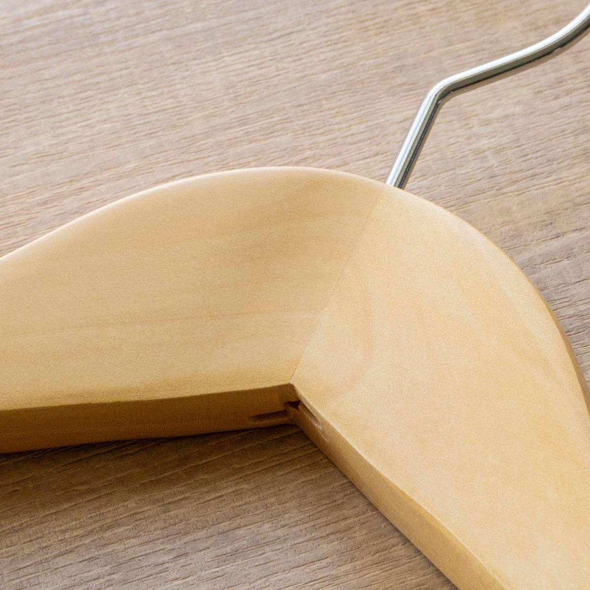 衣類をきれいに保ちながらすっきり収納できるスライド式の木製ハンガーです。肩部分にしっかりと厚みを持たせた設計で、衣類に跡がつきにくく、美しいシルエットをキープします。スラックスなども掛けられ、1本で幅広くお使いいただけます。ご家庭はもちろん、ホテルや宿泊施設にも最適な仕上がりです。