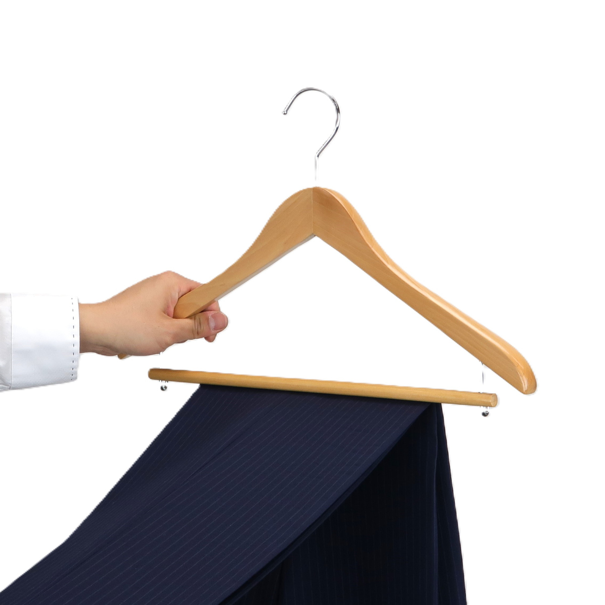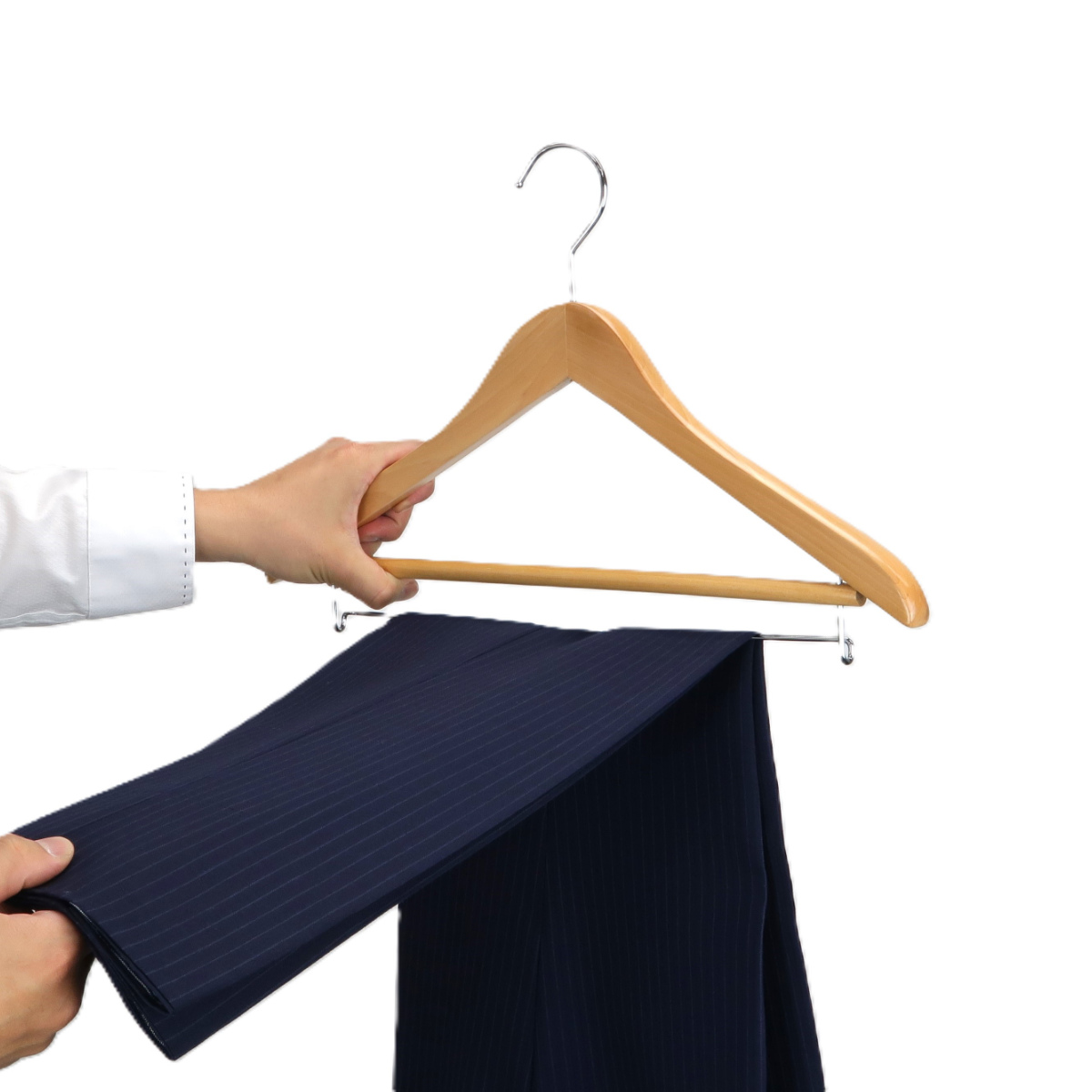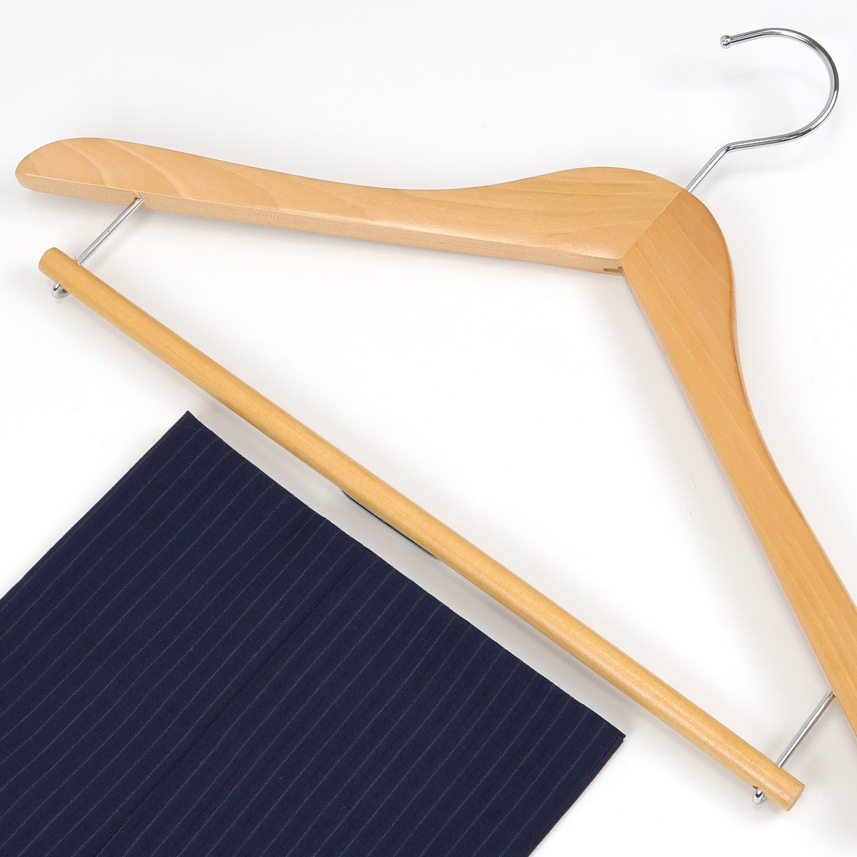 温かみのある天然木を使用したハンガーです。和室・洋室どちらの雰囲気にも馴染むシンプルなデザインです。高級感溢れる木製ハンガーなので、クローゼットの中で大切なジャケット・スーツなどのお洋服を収納するのはもちろん、来客用として人目に触れるシーンでも活躍します。