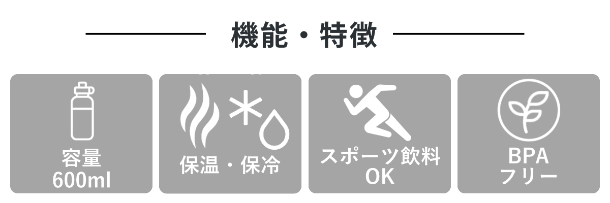 | 材質 | 本体・底:18-8ステンレス鋼(塗装) 栓・栓カバー・キャップ:ポリプロピレン ボタン:アクリロニトリルスチレン、アクリルゴム ボタンロック:ポリアセタール 栓・キャップパッキン:シリコーンゴム BPAフリー |