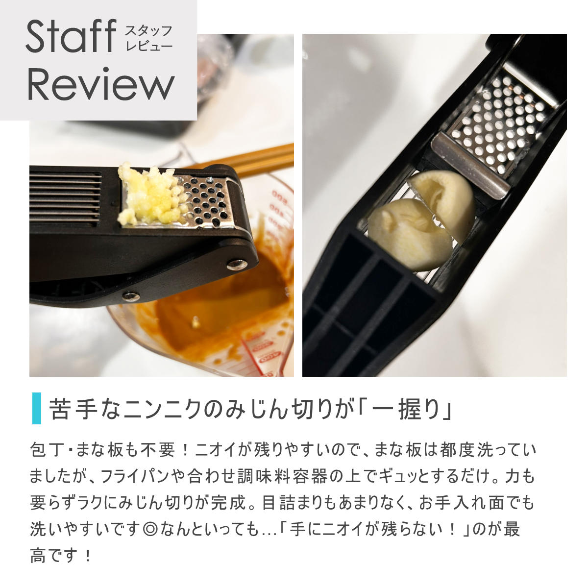 ニンニクや生姜を入れて握るだけで、簡単にみじん切りとスライスができます。手を汚さずに済むので、ニンニクのにおいが手に付いてなかなか取れない…という悩みを解消してくれます。