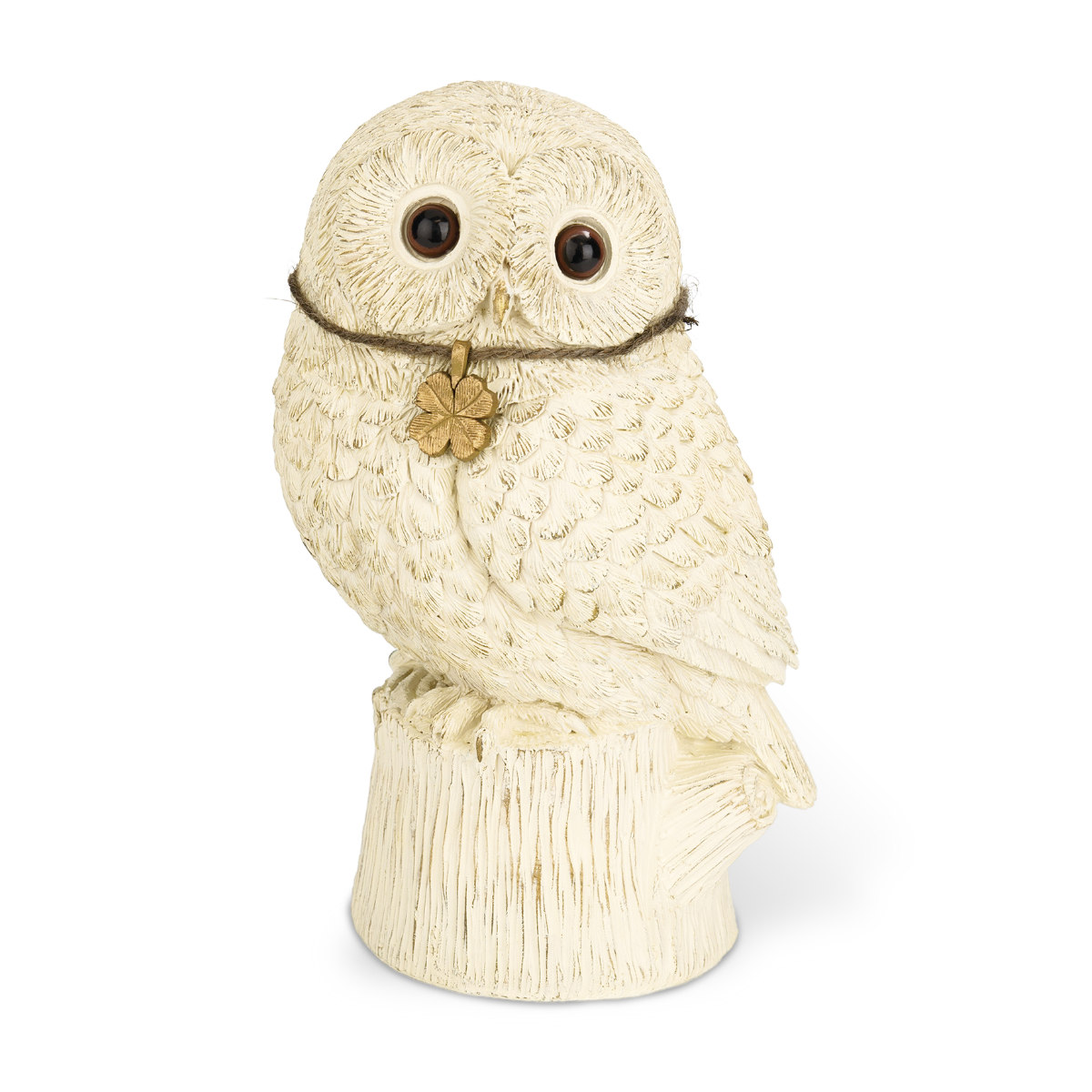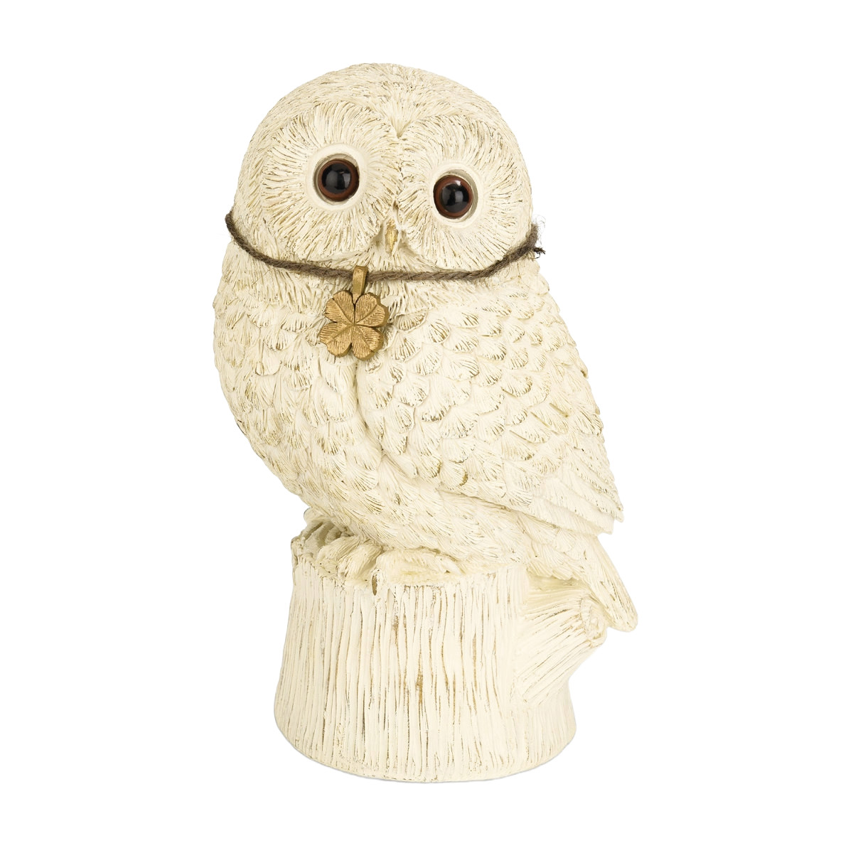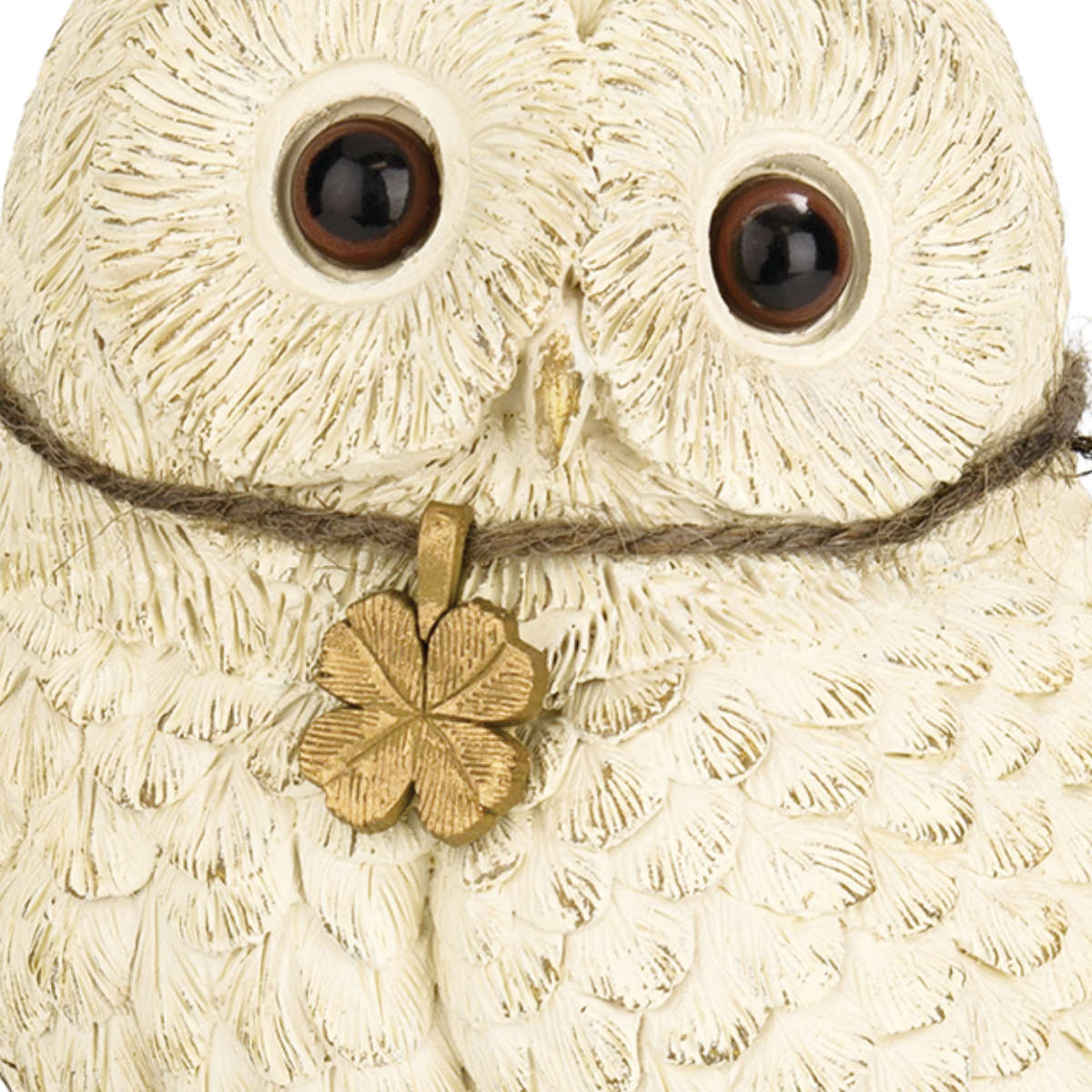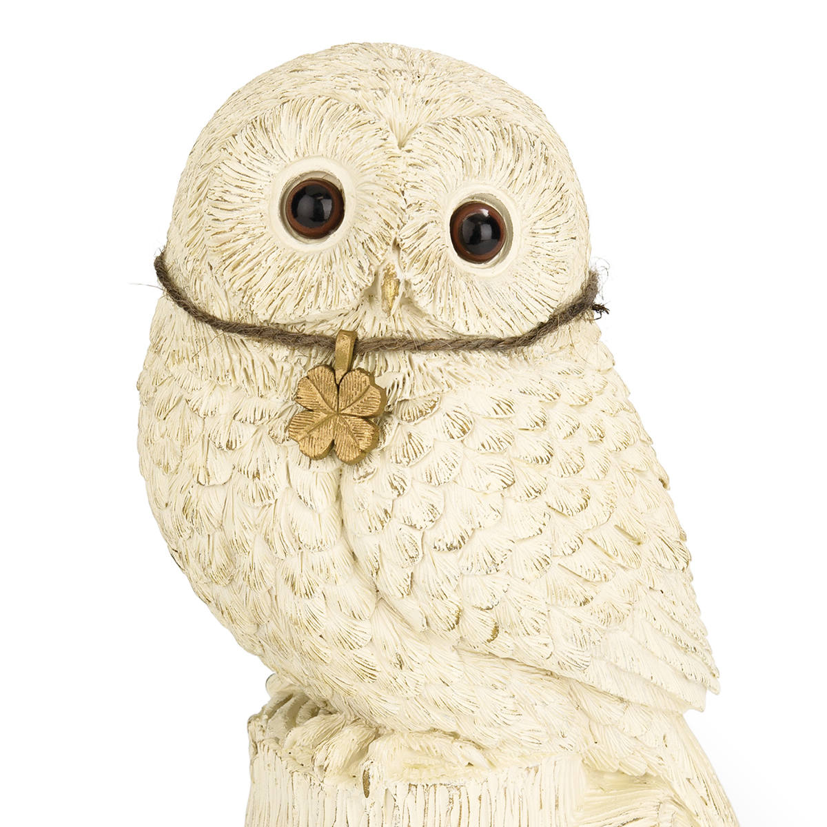 胸元には、幸せを運ぶ四つ葉のクローバーのゴールドチャーム。繊細な羽毛の流れや瞳の表現にこだわり、リアルな可愛らしさを表現しています。アンティーク調の雰囲気をプラスした、こだわりの作り込みで、お庭だけでなくお家のインテリアとしてもお楽しみいただけます。