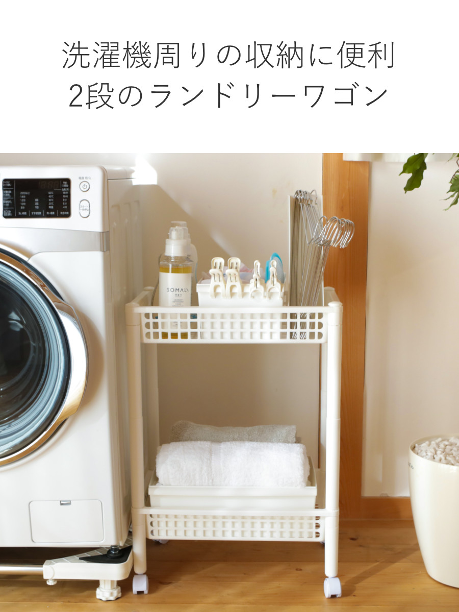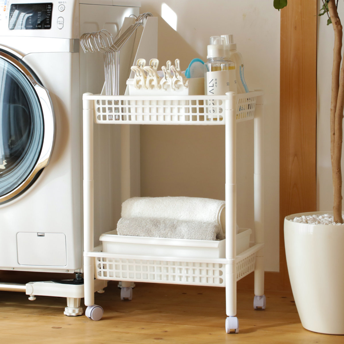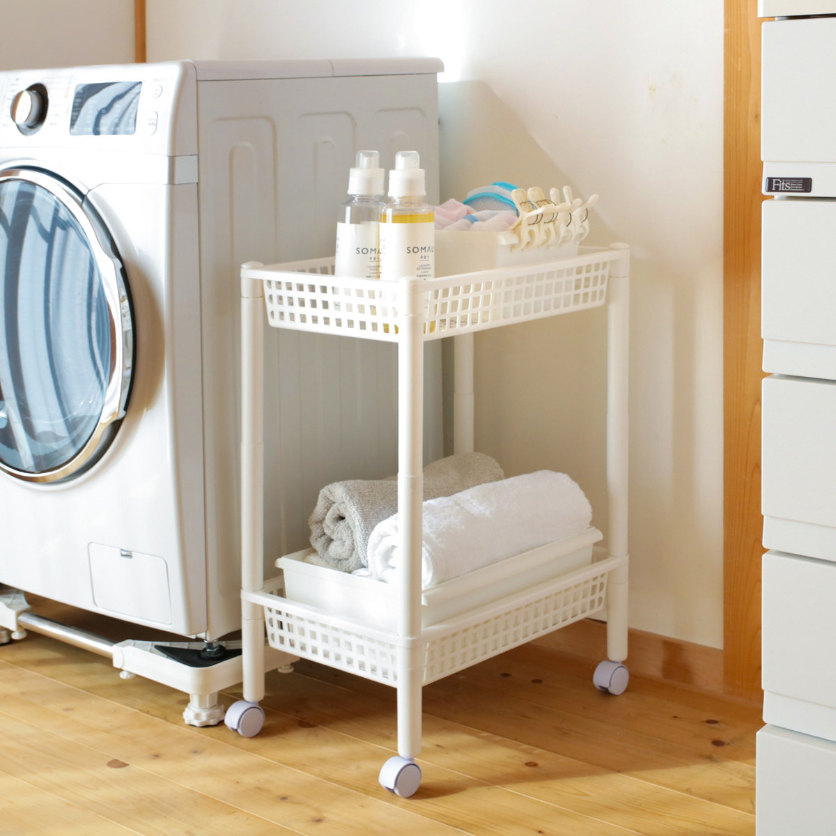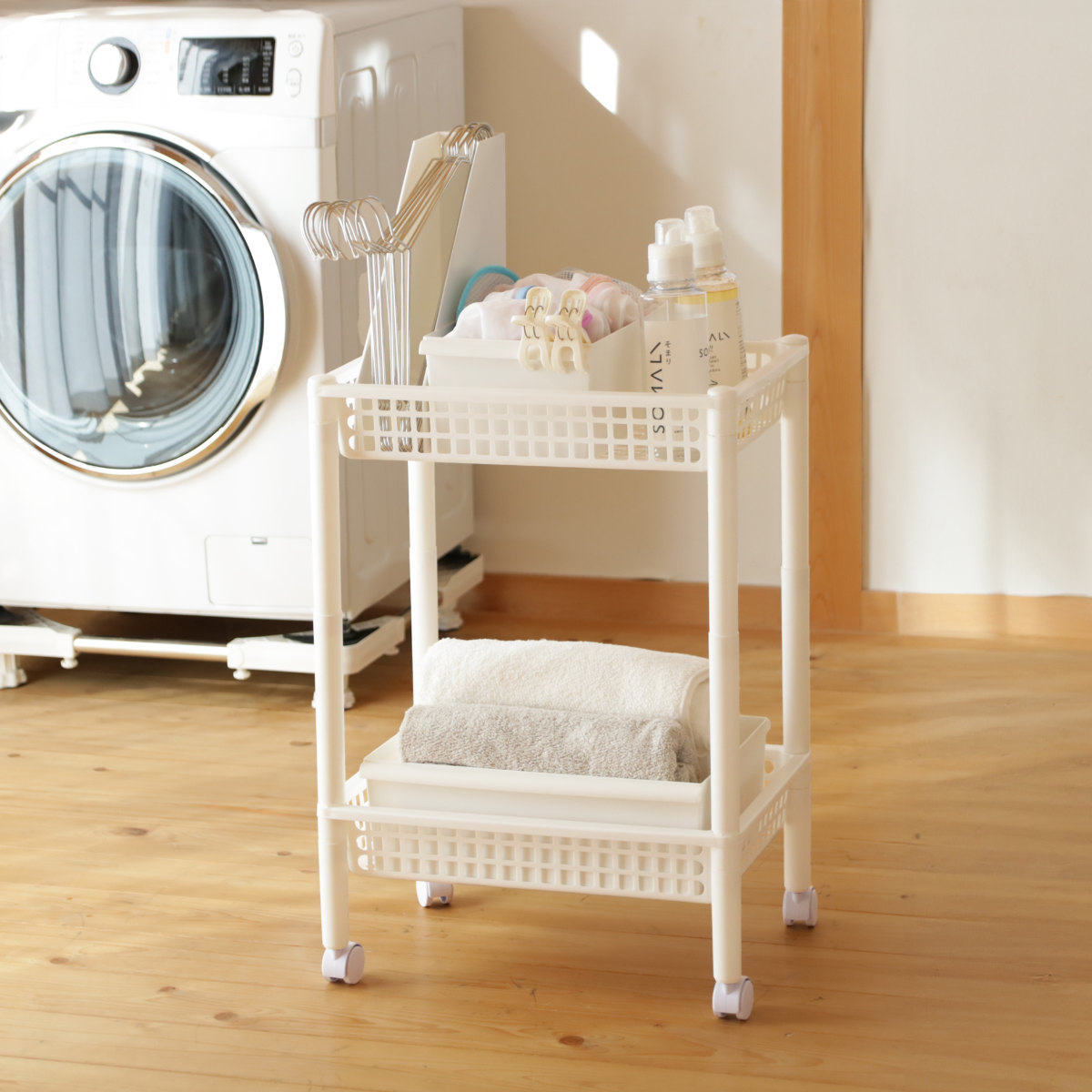 洗濯機周りのサニタリー用品の収納に便利な、2段タイプのランドリーワゴンです。タオルやバス用品、洗濯用品の収納はもちろん、キッチン周りの小物や食品ストックの収納としてもお使いいただけます。