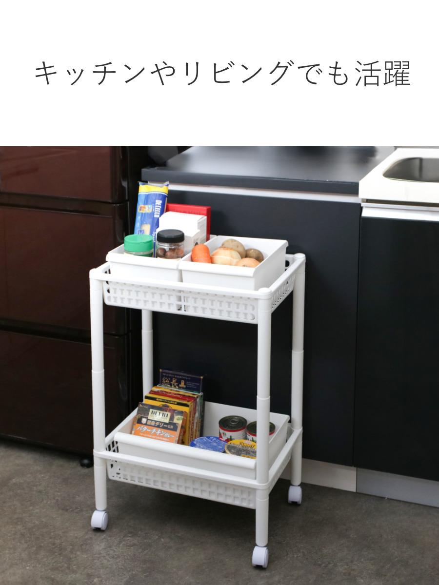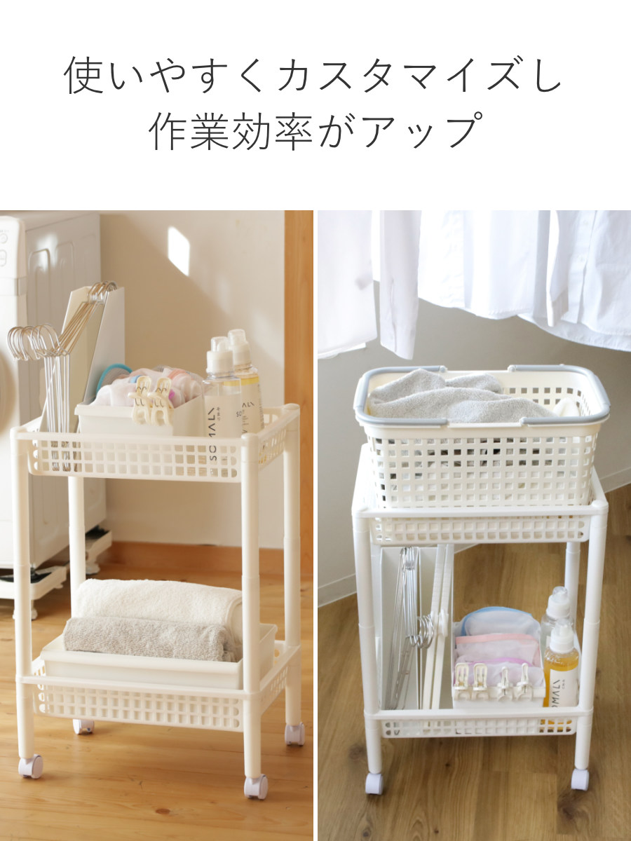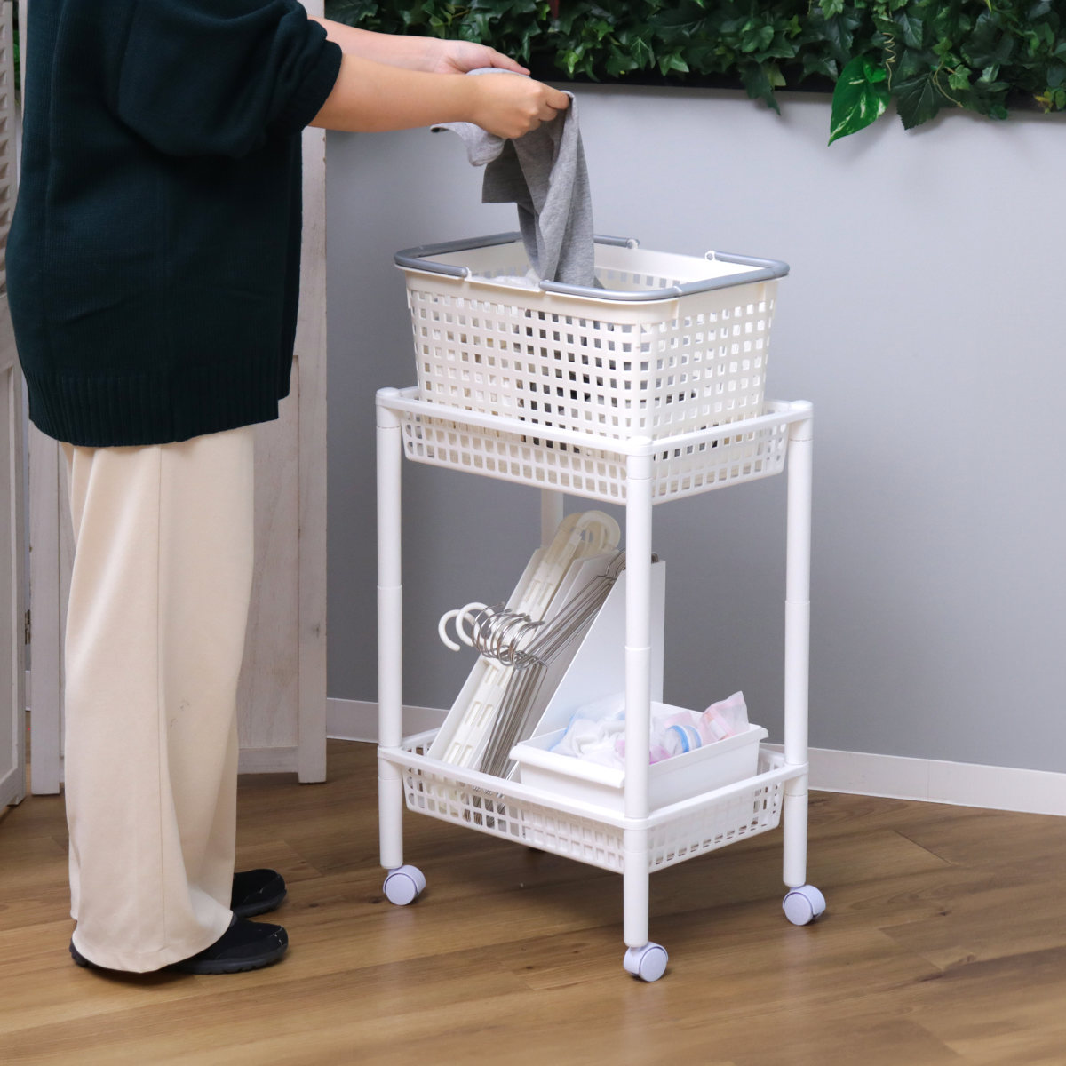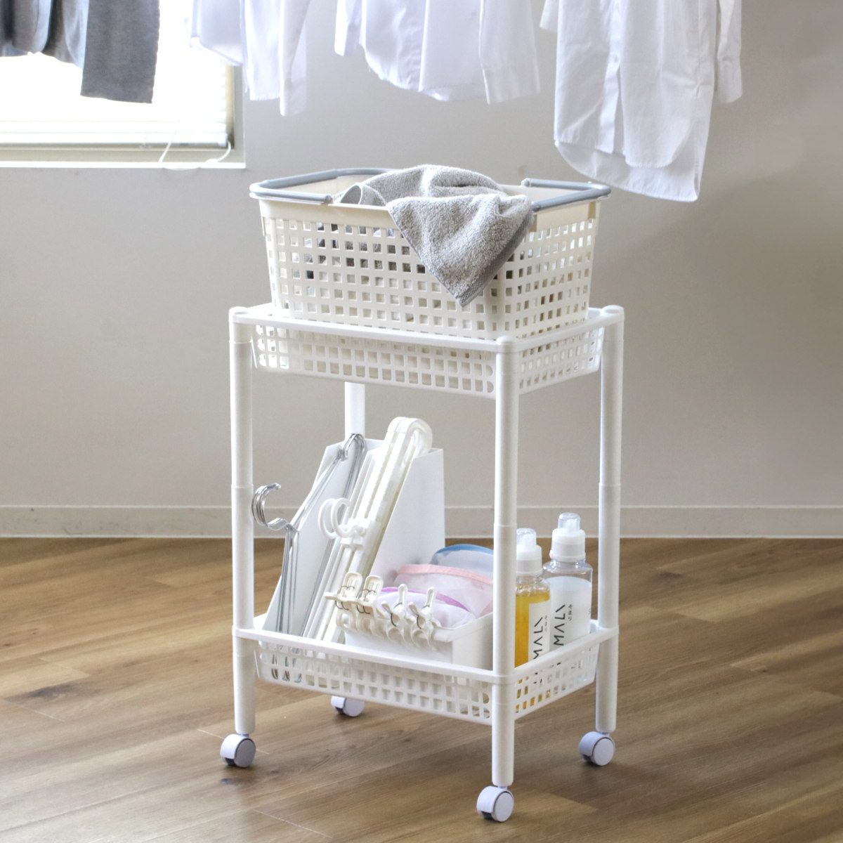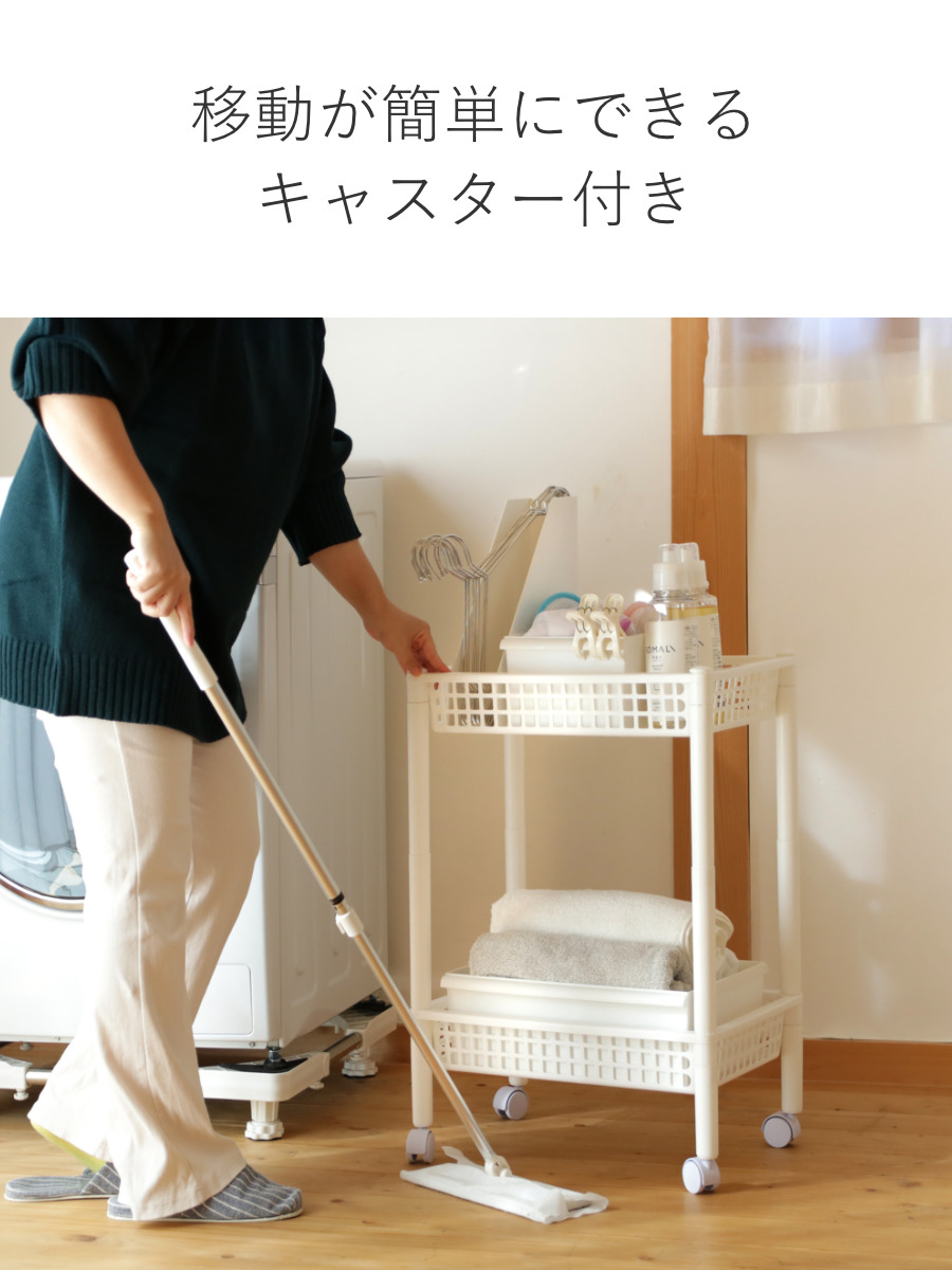 洗濯機周りのサニタリー用品の収納に便利な、2段タイプのランドリーワゴンです。タオルやバス用品、洗濯用品の収納はもちろん、キッチン周りの小物や食品ストックの収納としてもお使いいただけます。