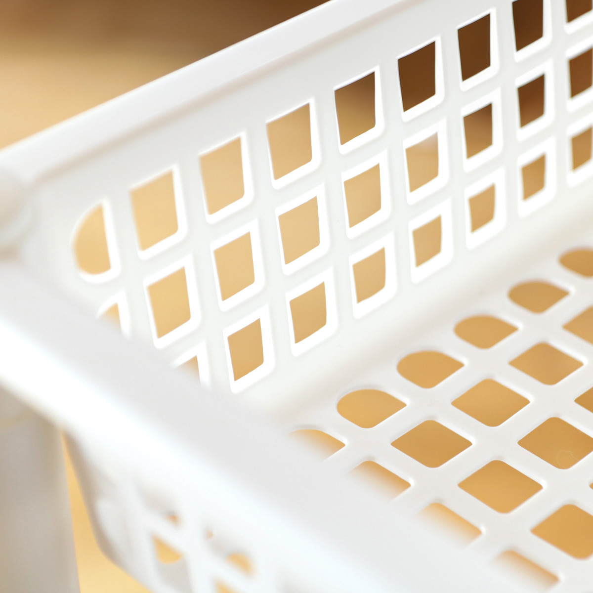 バスケットはメッシュデザインで通気性もよく、洗濯物の臭いがこもりにくいです。キッチン周りでの野菜ストックにもピッタリです。