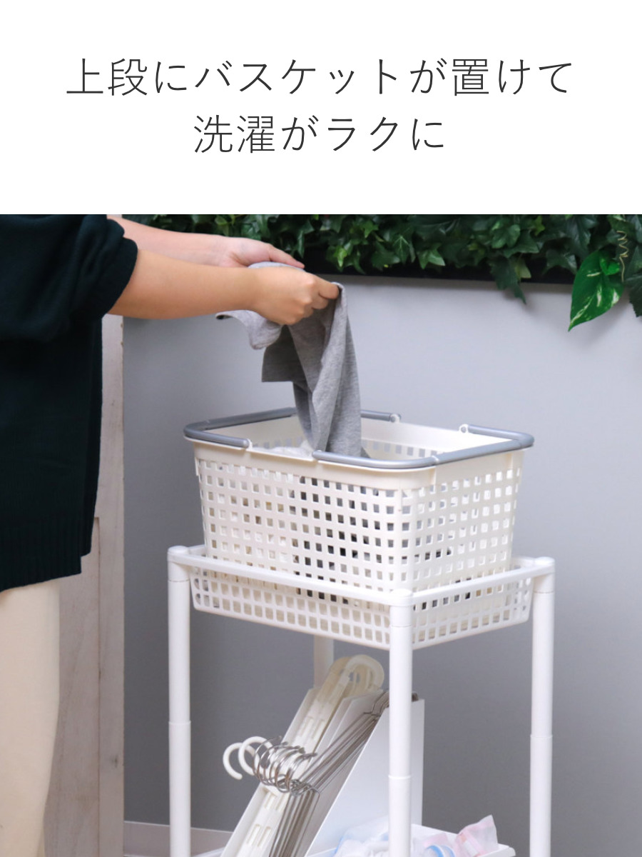 別売りのランドリーバスケットを上段に置くことで、立ったまま洗濯物が取れるようになり、洗濯時に腰をかがめる必要がなくなります。 干すときはもちろん、洗濯機から洗濯物を移すときもラクになります。