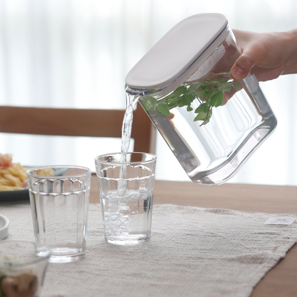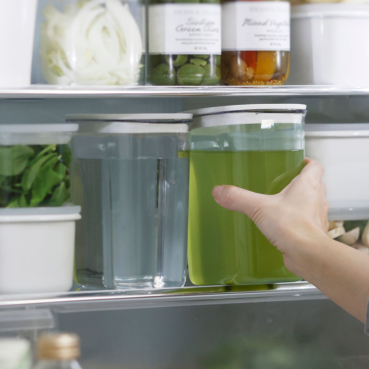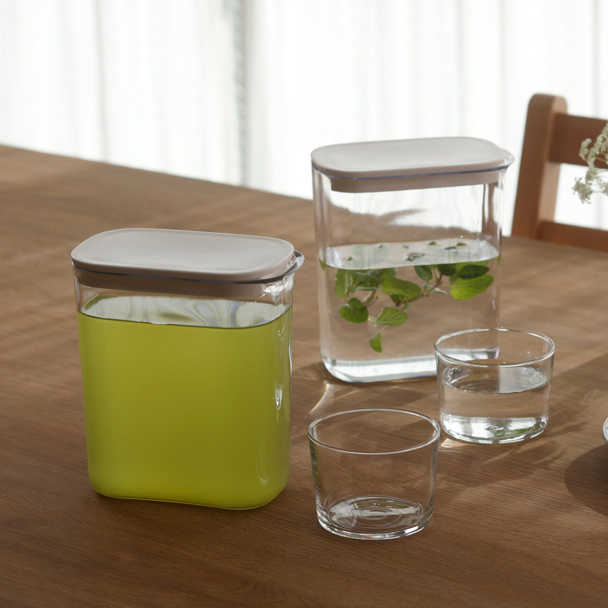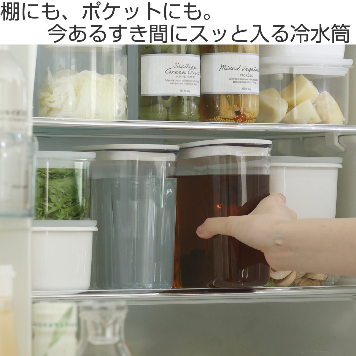 1~2人暮らしに使いやすい容量1Lです。スリム設計の冷水筒は、冷蔵庫のドアポケットにもスッキリと収まります。