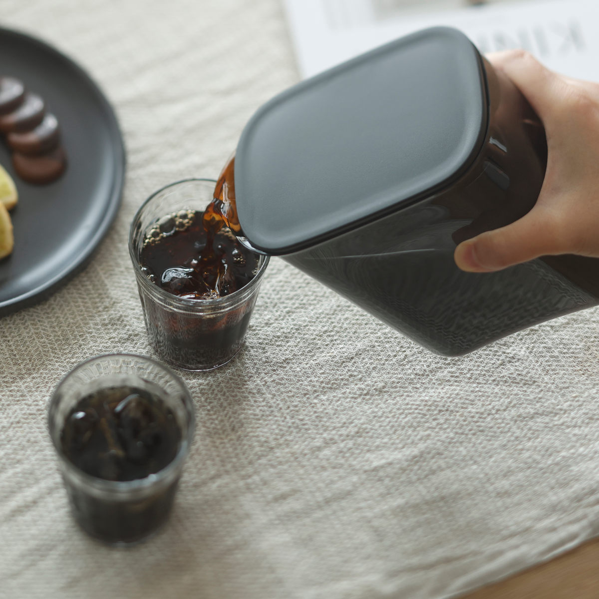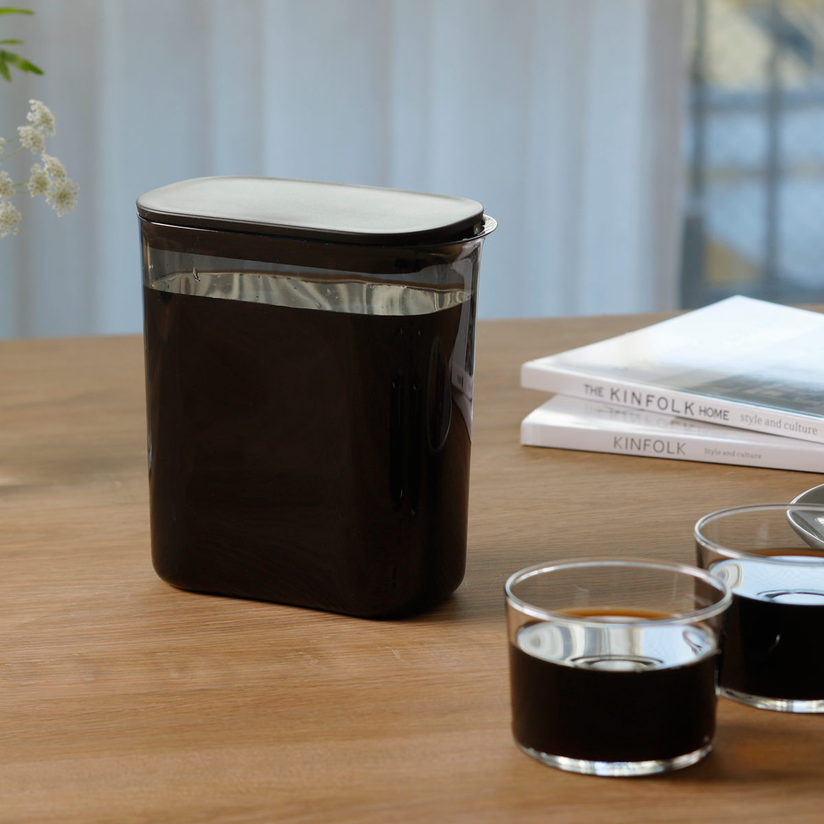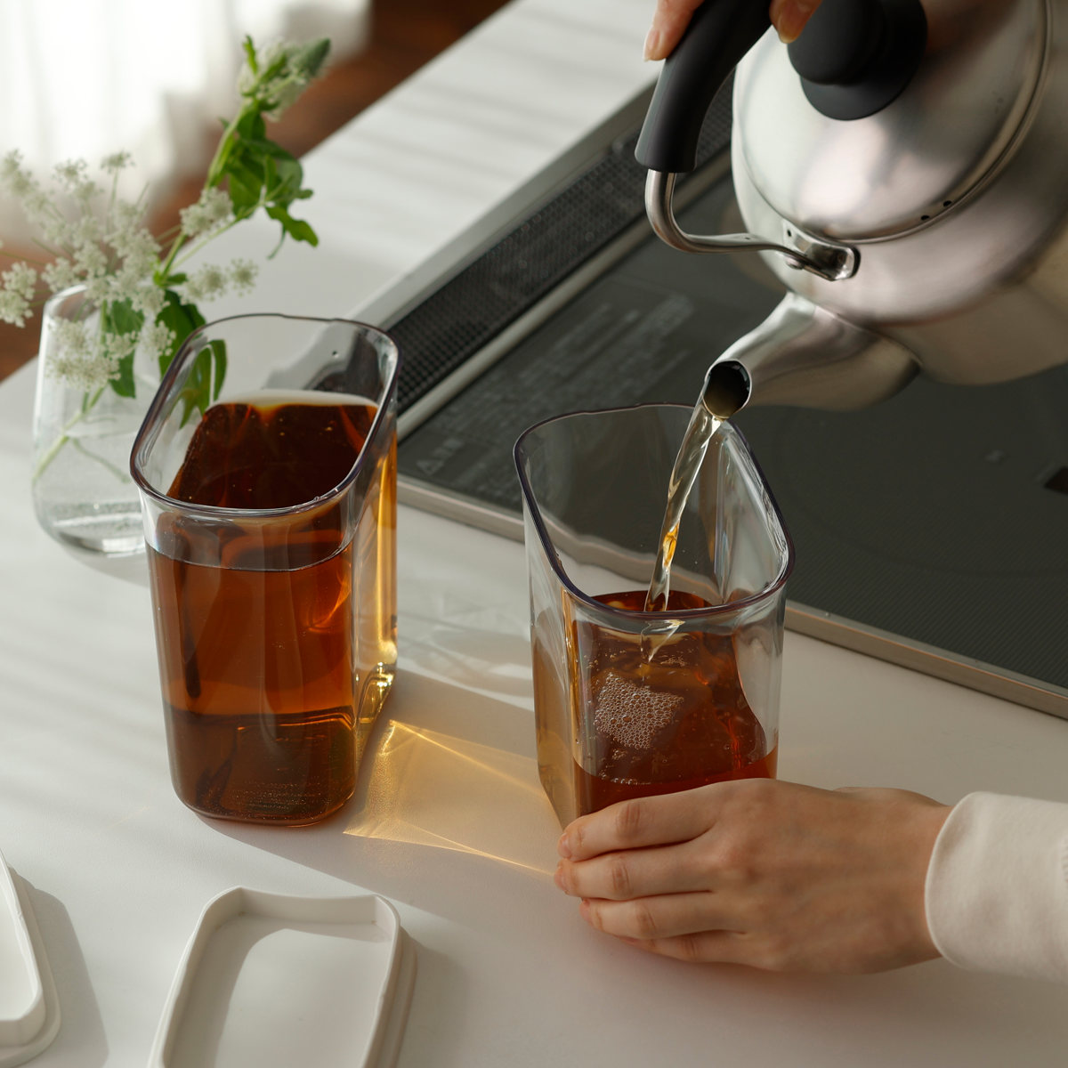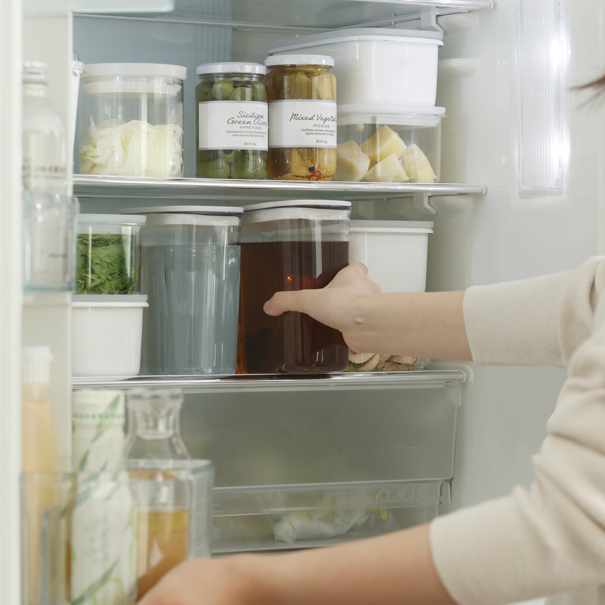 1~2人暮らしに使いやすい容量1Lです。スリム設計の冷水筒は、冷蔵庫のドアポケットにもスッキリと収まります。