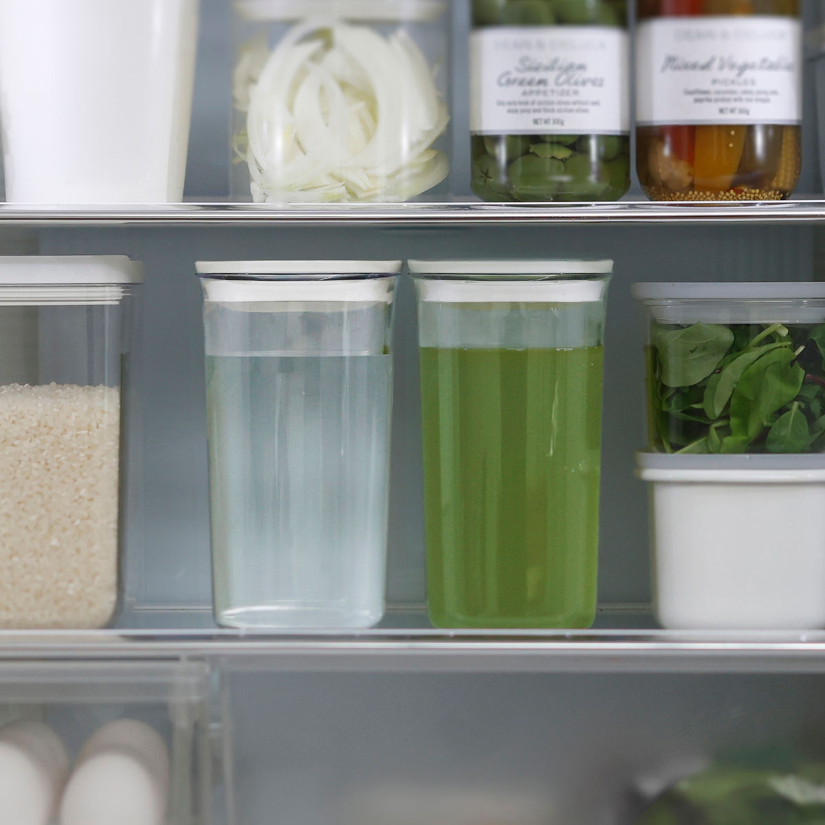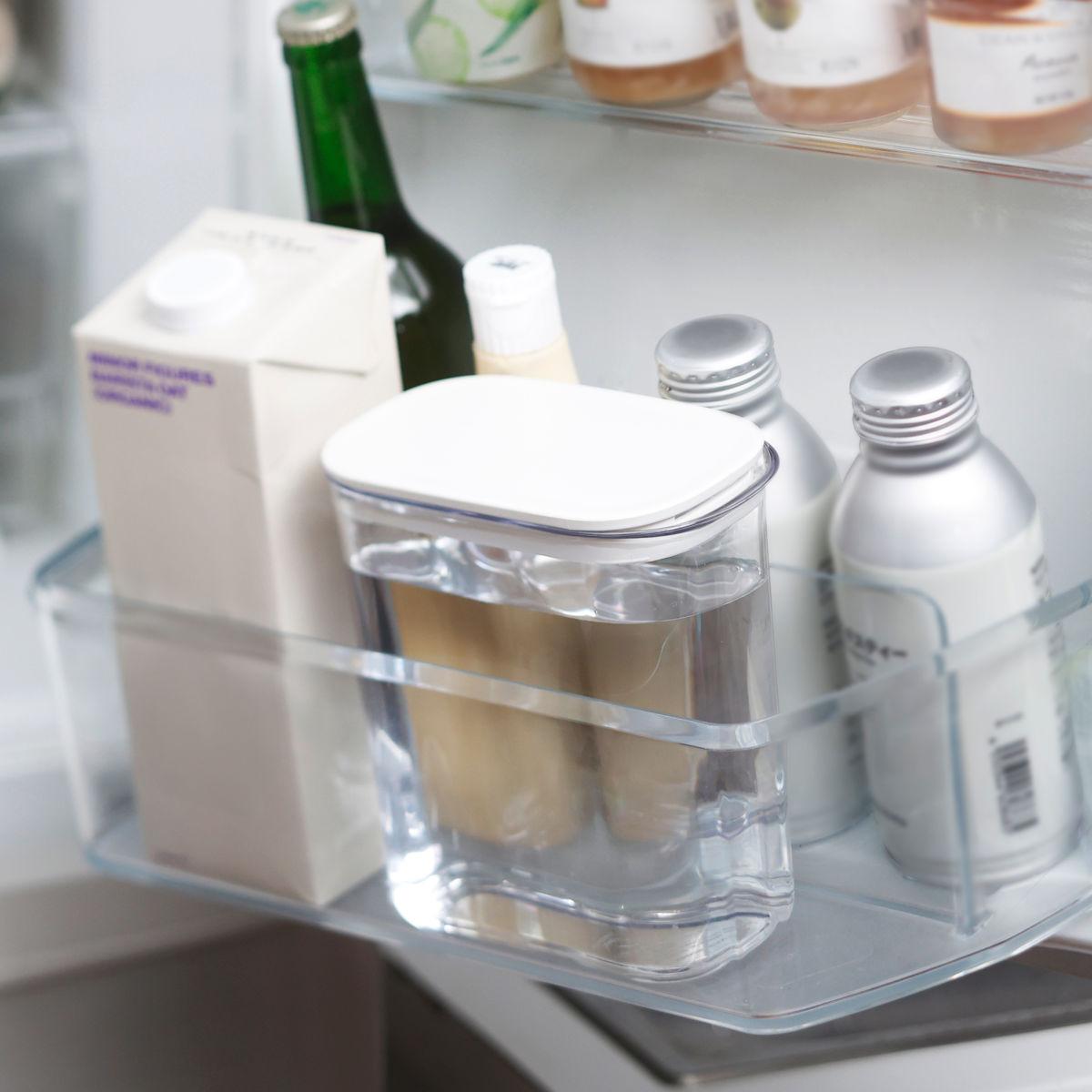 両サイドにくぼみがあり、指がフィットして持ちやすい形状です。取っ手がなくても冷蔵庫からの出し入れや食卓に運ぶ際にもサッと移動できます。