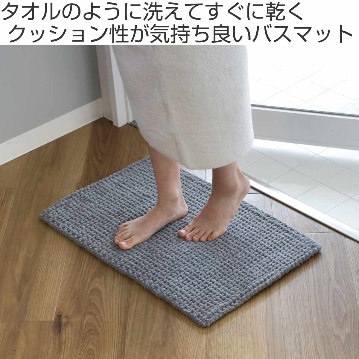 抗菌防臭加工済みで繊維上の細菌の増殖を抑制し、バイキンや気になるニオイをしっかり防ぎます。タオルのようなバスマットなので、汚れたら手軽にサッと洗え、すぐに乾きます。