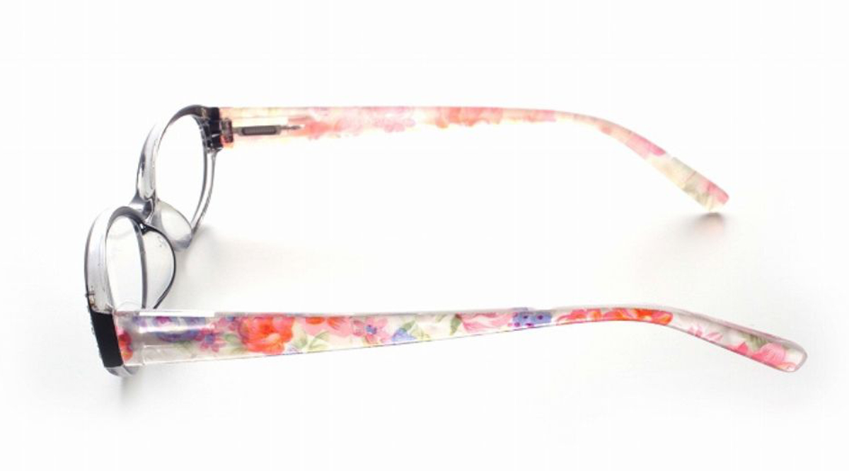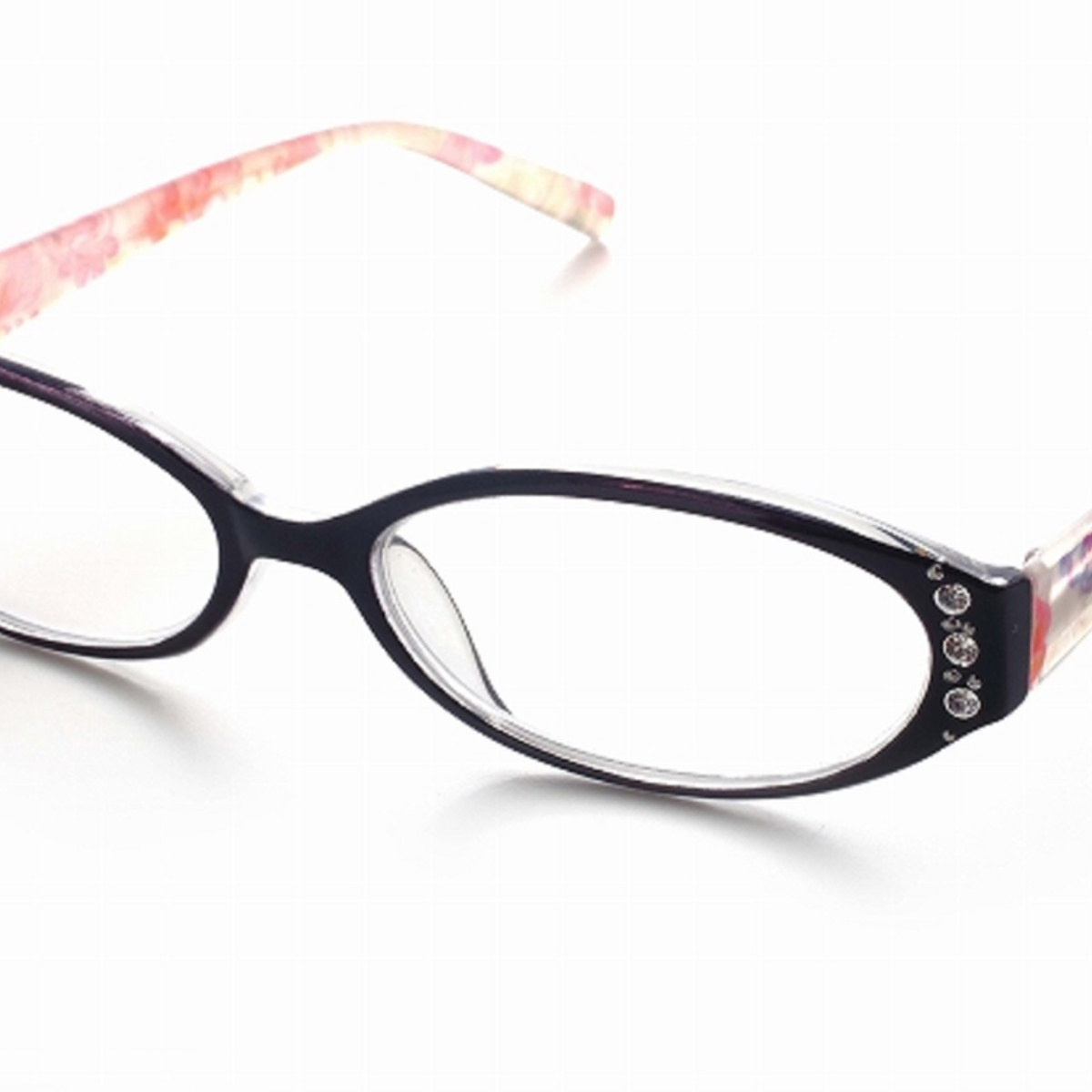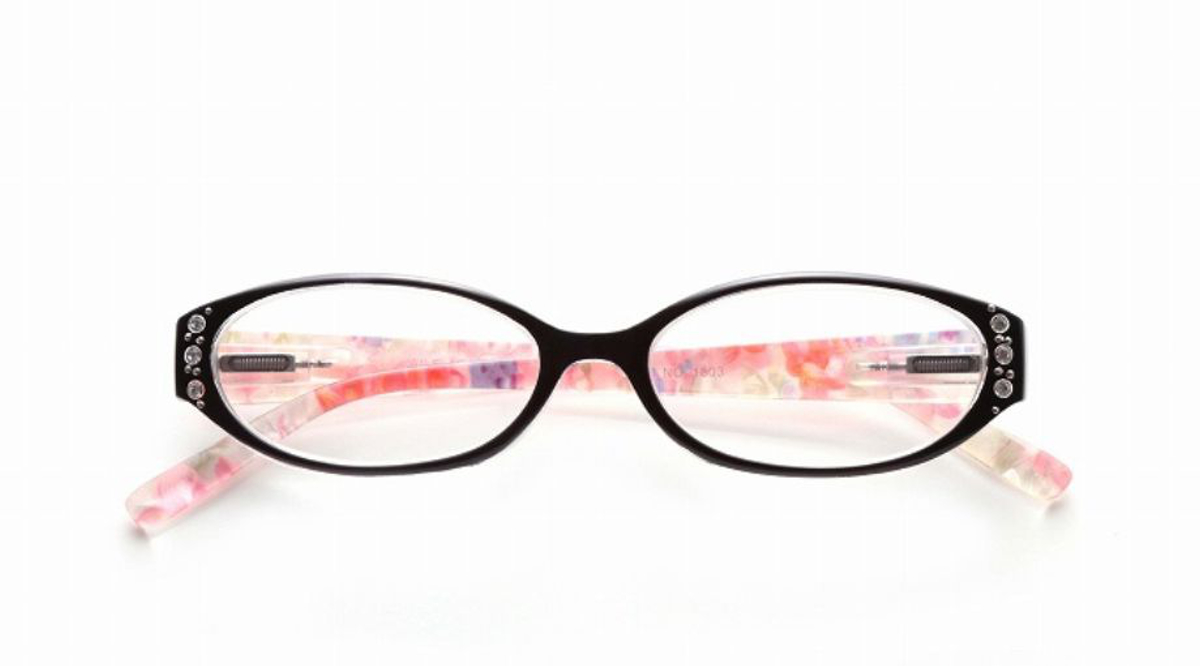 華やかなピンクと黒のフレームに輝く装飾が目をひくお洒落なシニアグラスです。デザインだけではなく、ポリカーボネート製で金属アレルギーにも対応、レンズにはブルーライトカットレンズを採用と実用性や使い心地にもこだわっています。