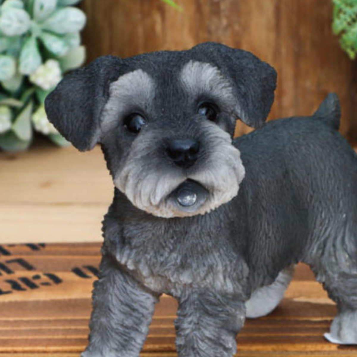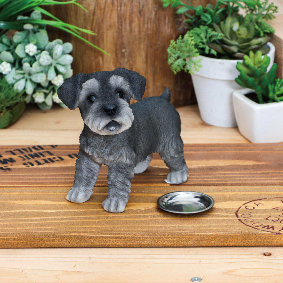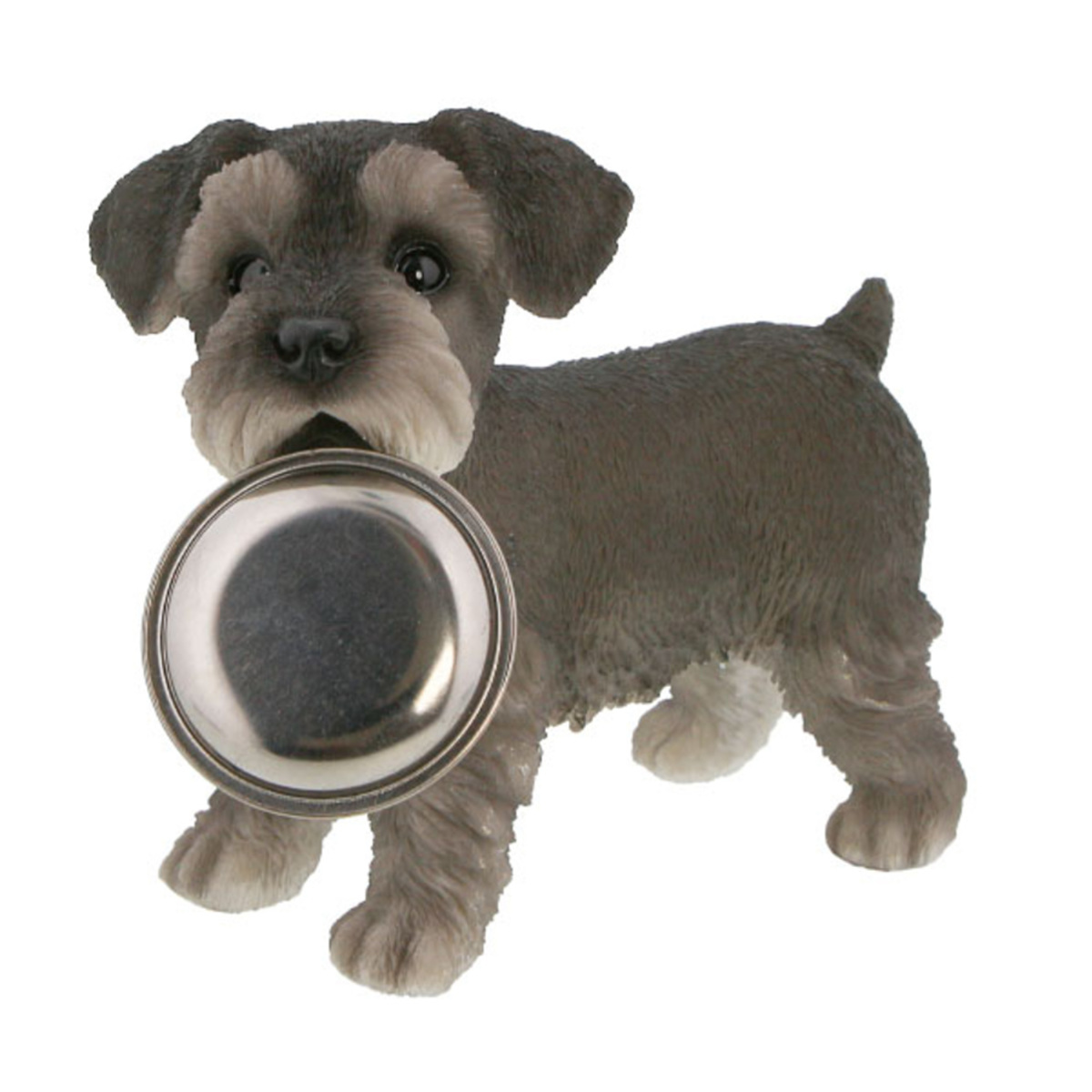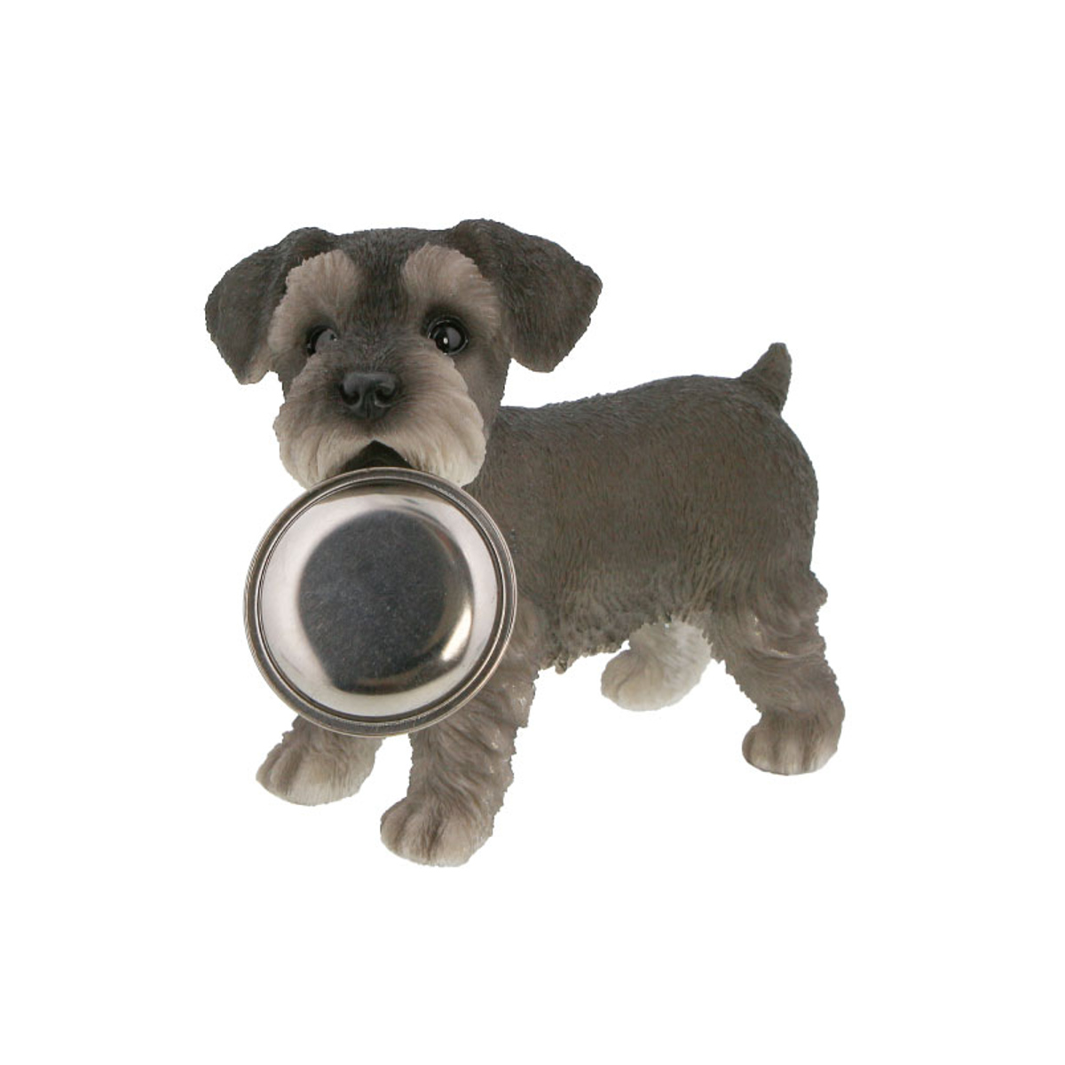 お皿をくわえたシュナウザーのガーデンオーナメントです。お庭のアクセントとしてはもちろん、玄関やお部屋のインテリアとしてもおすすめです。