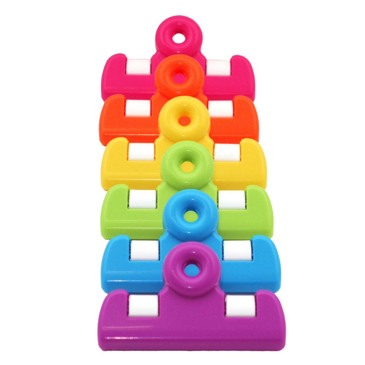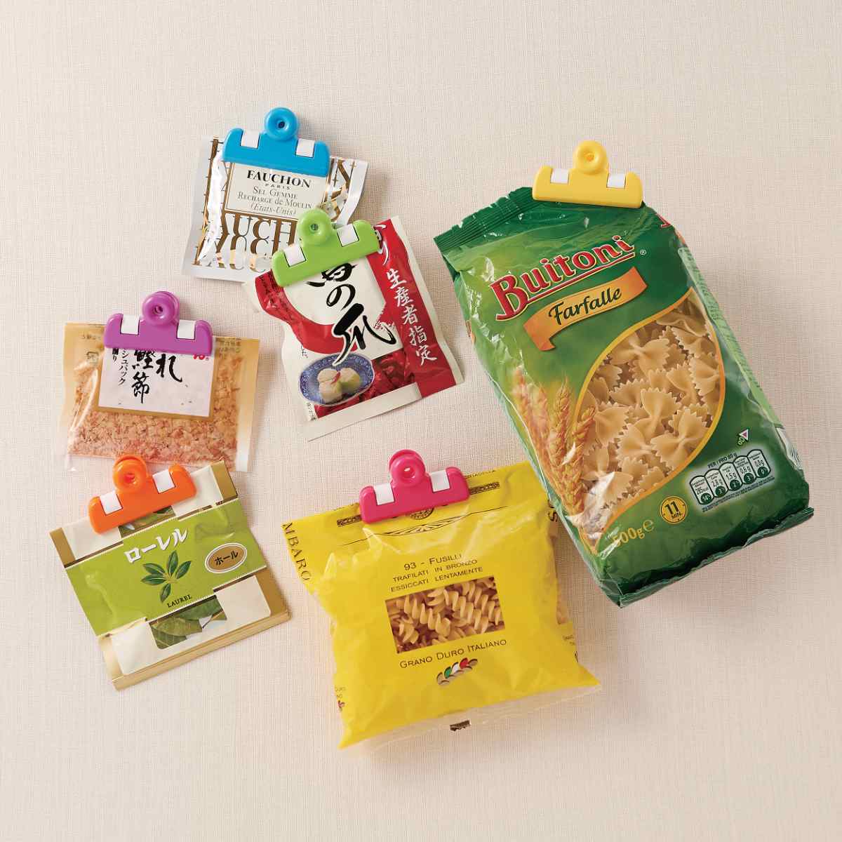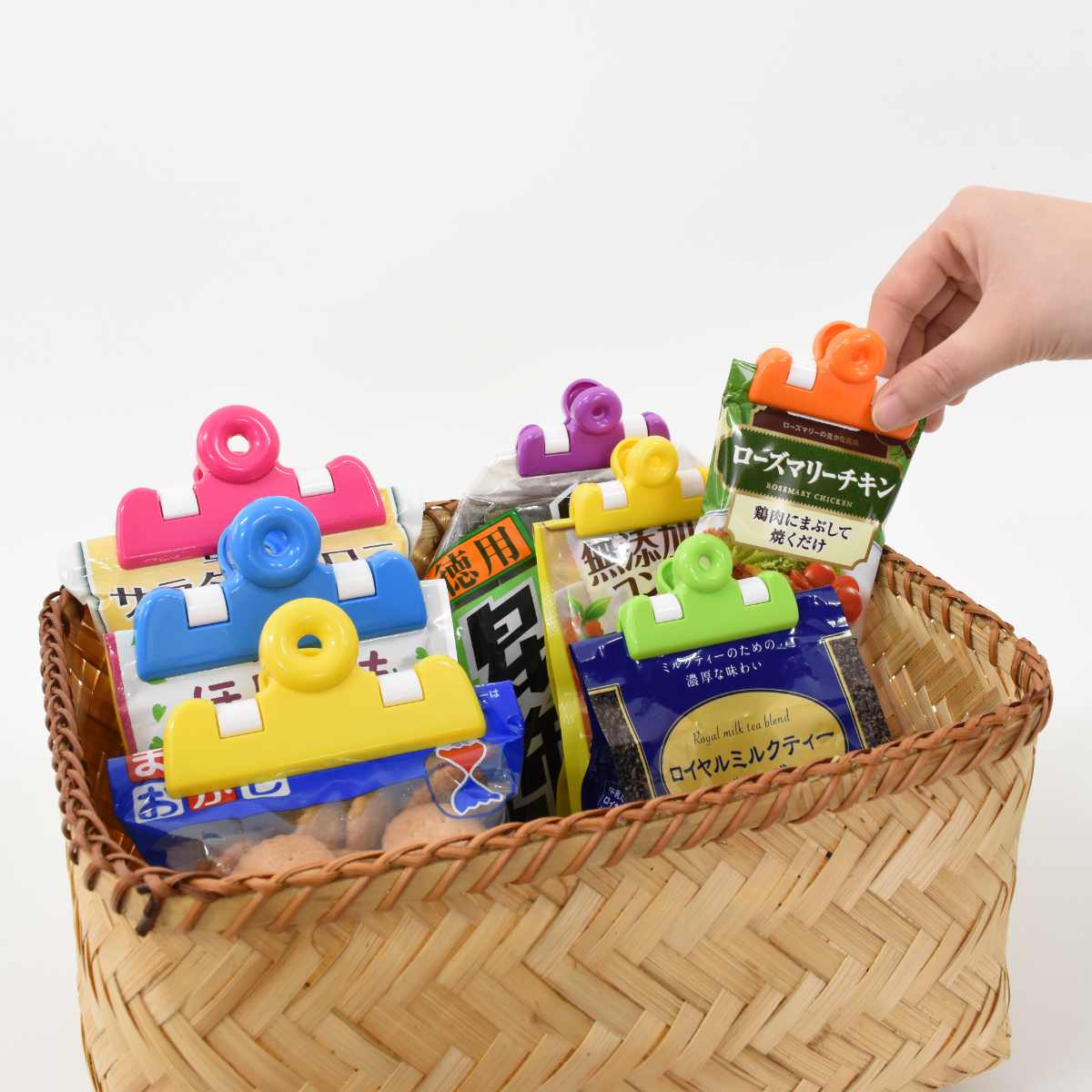 バネまでオールプラスチック製で、水気の多いキッチンで大活躍のミニクリップです。薄いものもしっかり挟むことができ、牛乳パックなどの厚紙の密封保存にも使えます。カラフルな6色入で用途に応じて使い分けができます。