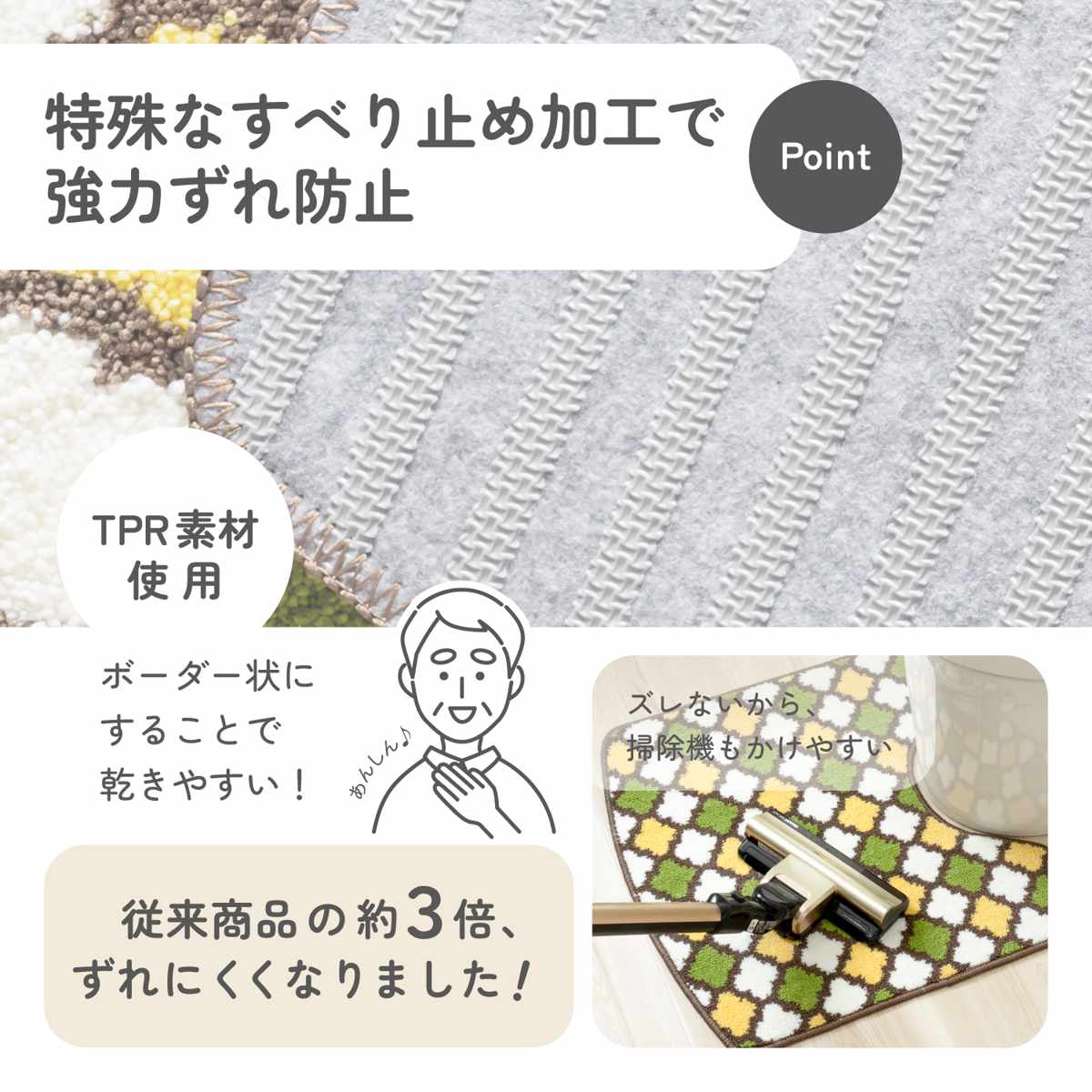 裏面には、すべり止め加工が施されているので滑りにくく安心です。ズレないので掃除機もかけやすいです。