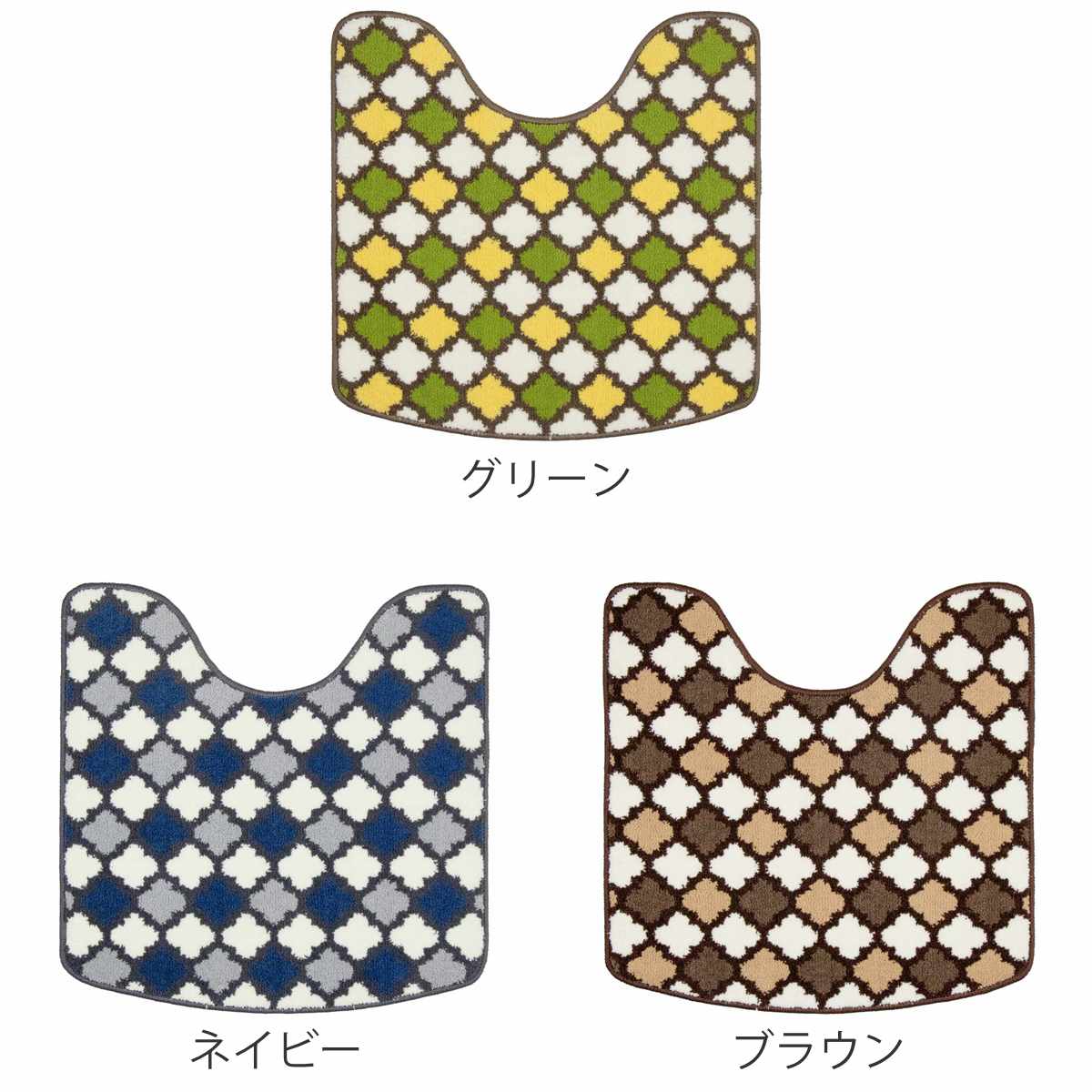 トイレマットと便座カバーをお揃いのデザインでコーディネートすることで、空間全体に統一感が生まれ、より洗練された印象に。ネイビー、グリーン、ブラウンの3色展開で、インテリアに合わせてお選びいただけます。