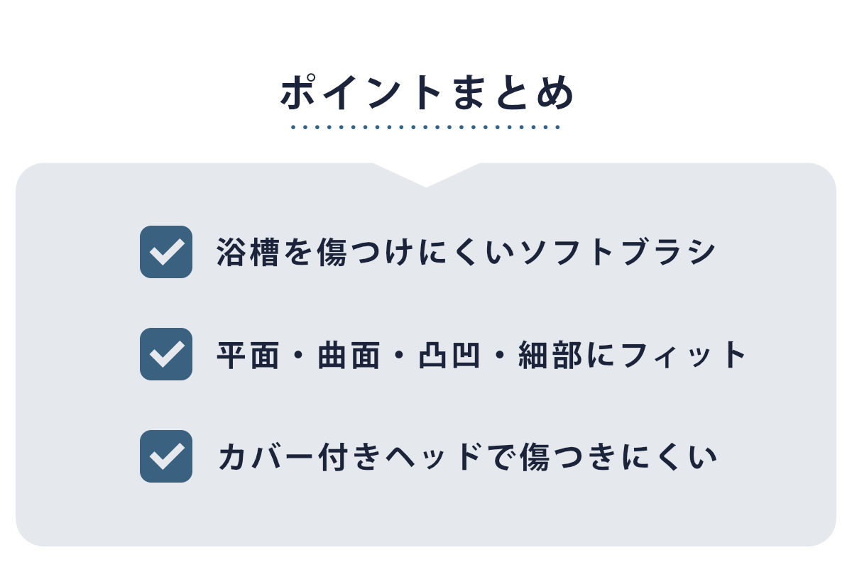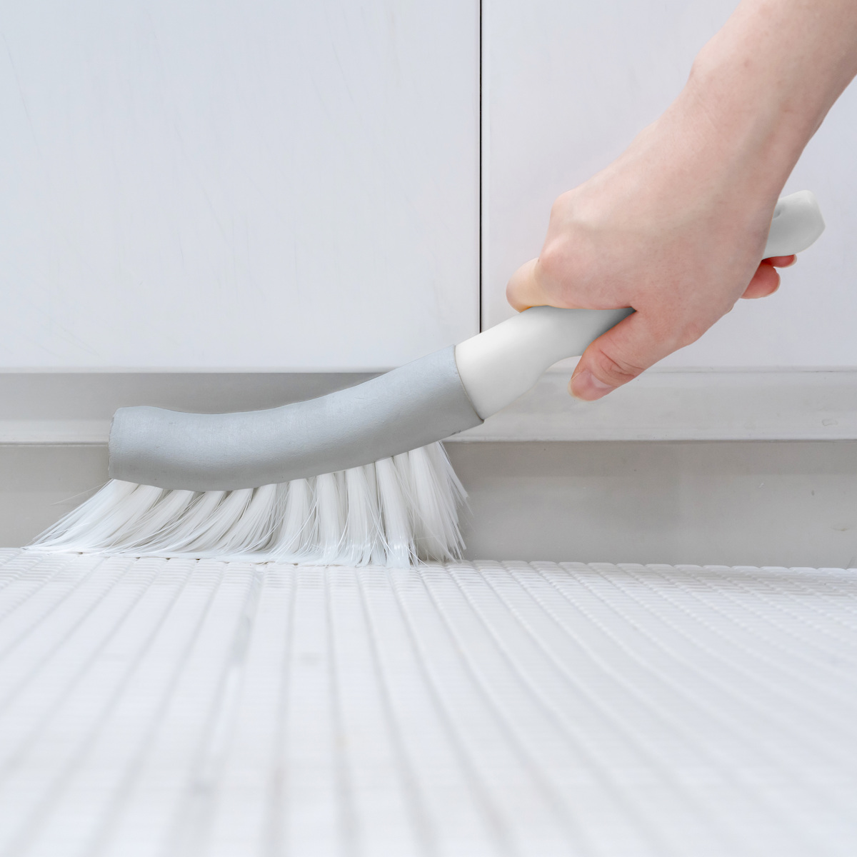 柔らかく密なブラシが平面・曲面・凸凹・細部にフィットして、浴室まるごとサッとキレイに洗うことができます。水栓金具等の細部や浴室の入り組んだ所にもしっかりフィットし、汚れを落とします。