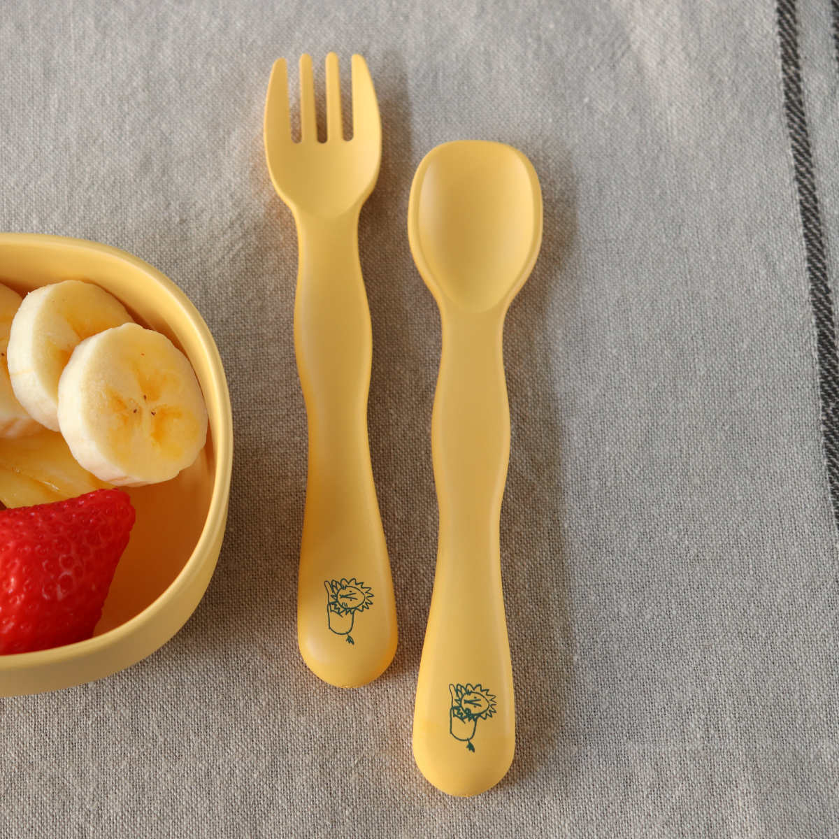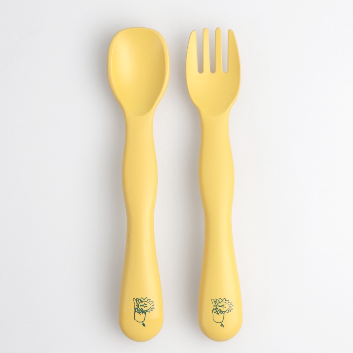 可愛いどーぶつのイラストが描かれたスプーンとフォークのセットです。お子様自身が使いやすい形状で、自分で食べたい意欲を育ててくれます。
