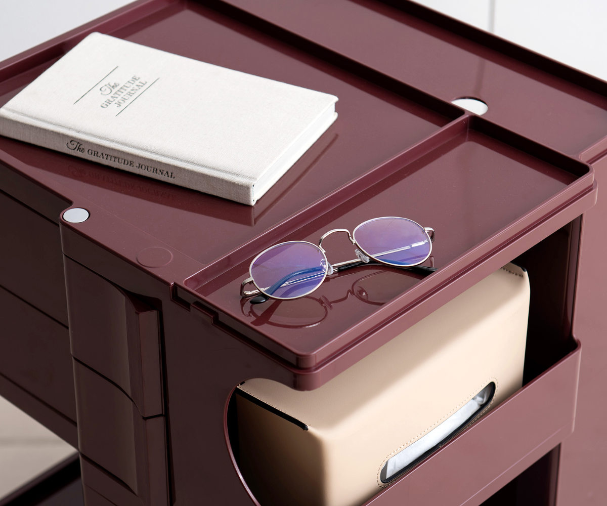180度回転するスライドトレー、深さの異なる2種類のポケット収納、取り出し簡単なオープンスペースがひとつに。シーンや用途に合わせてマルチにご使用いただけます。