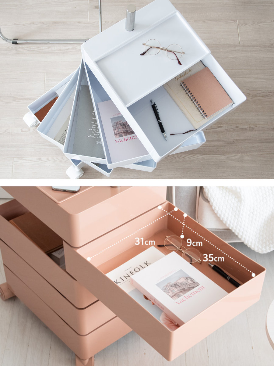 360度回転式、たっぷり収納&A4対応の多段トレー